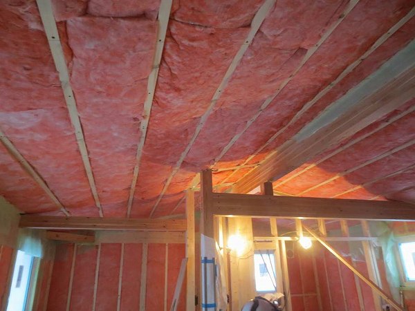 屋根下地と直行方向に下地を組んで105㎜を充填していきます。