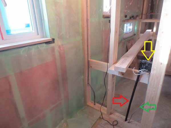 緑矢印が電線、赤矢印はTVやLANの配線をするための配管になります。