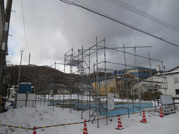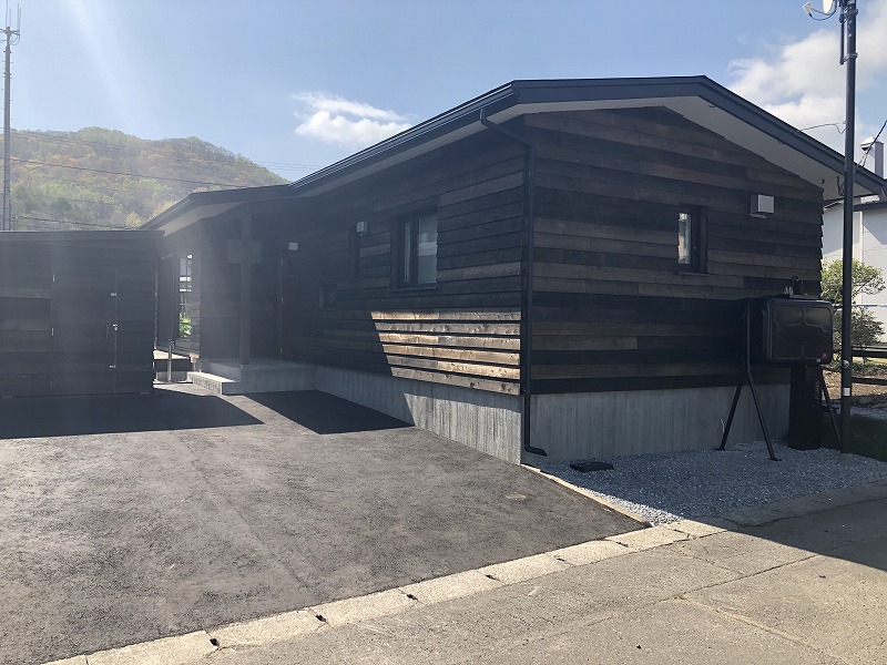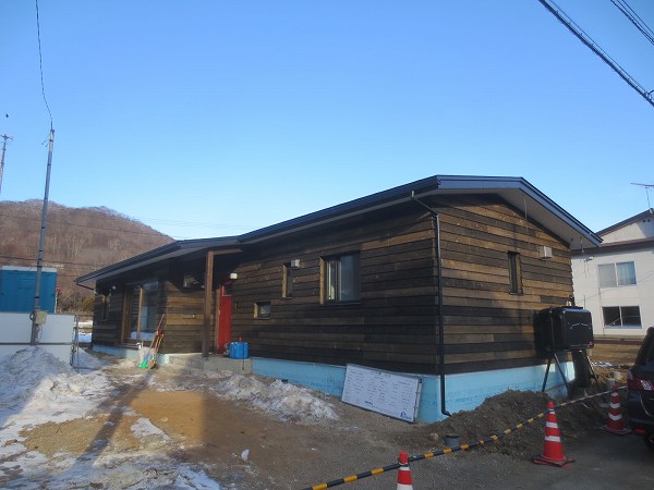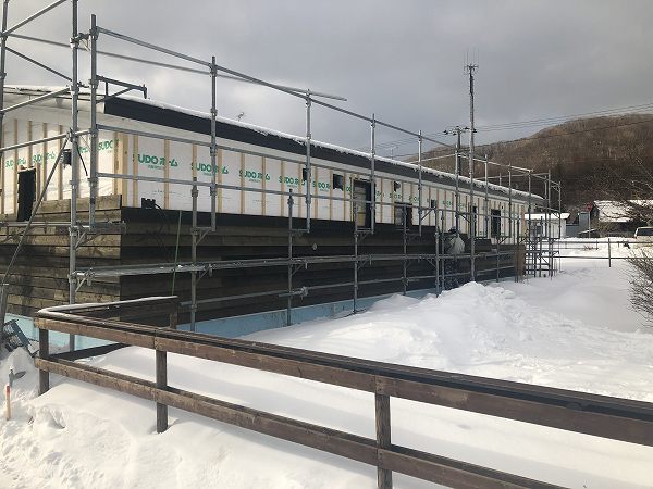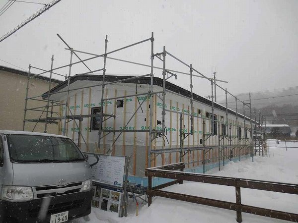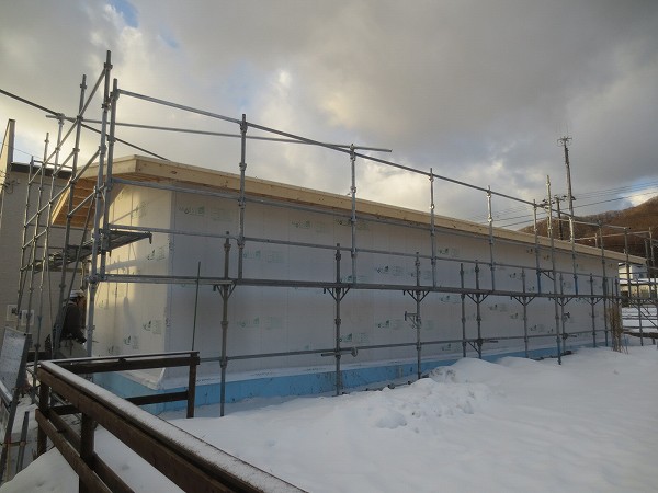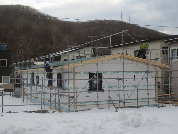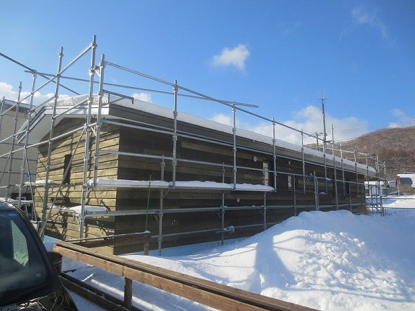 外壁板張りも完了です。それにしても建設地は室蘭市にしては雪が多いです。