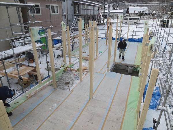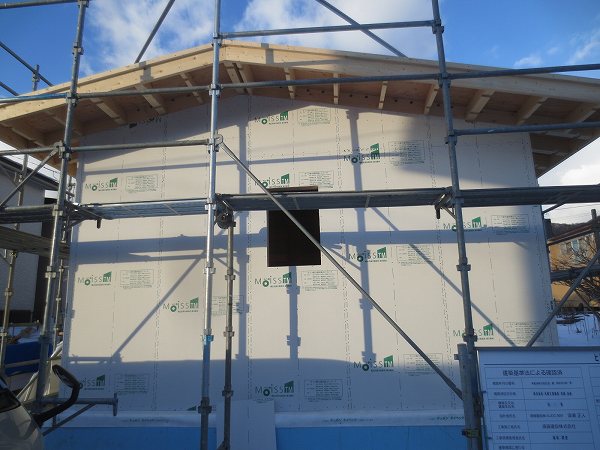 外部足場架けも完了しいよいよ大工さんが乗り込んできます。