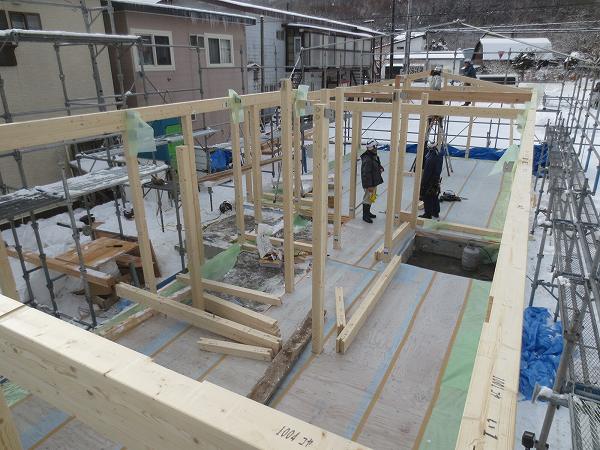 棟木(屋根で一番高い所の材料)が架かりましたね。奥では間柱も取り付けています。