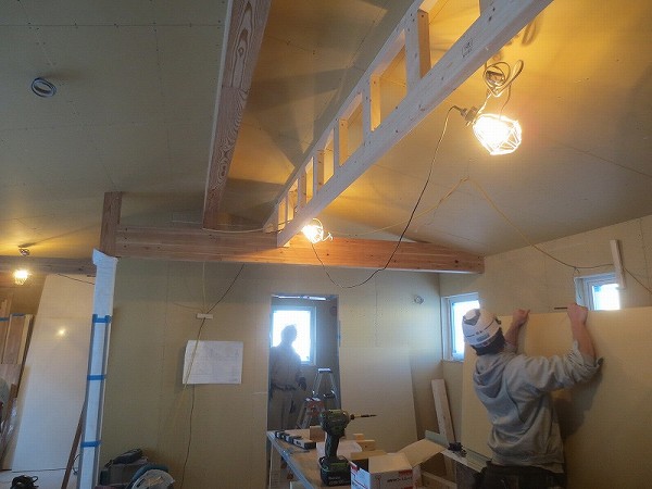 断熱材・気密シート張りが完了しましたので、おなじみの虎(石膏ボード)の出番です。