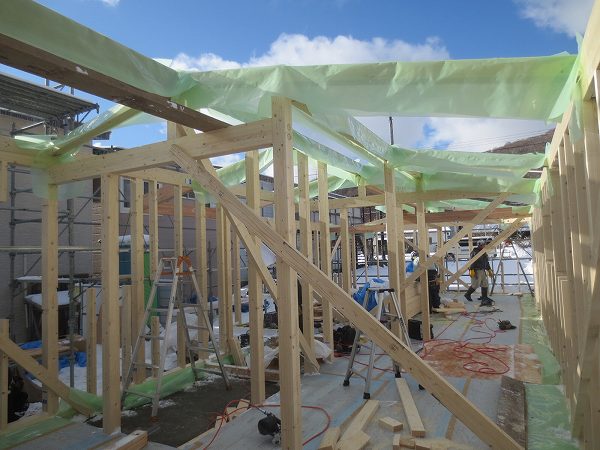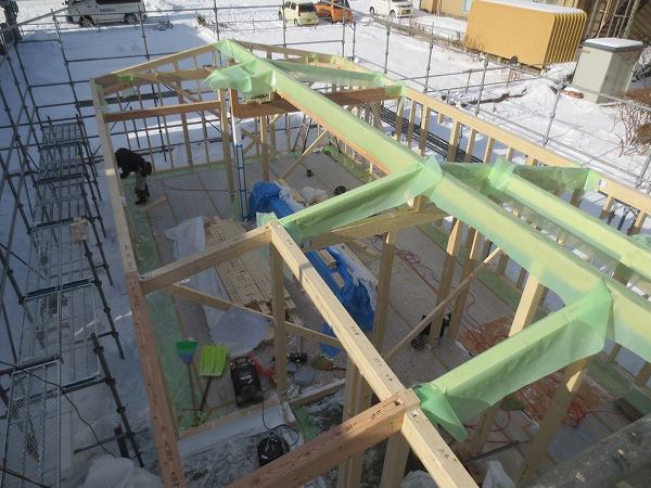 梁と桁材を架けていきます。先張りの気密シートも忘れずに!!