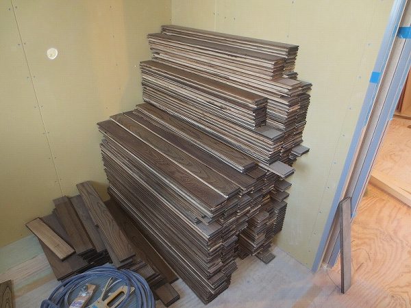 フローリングが搬入されました。今回の色はエボニーなので大工さんが張る前に一度塗装してあります。