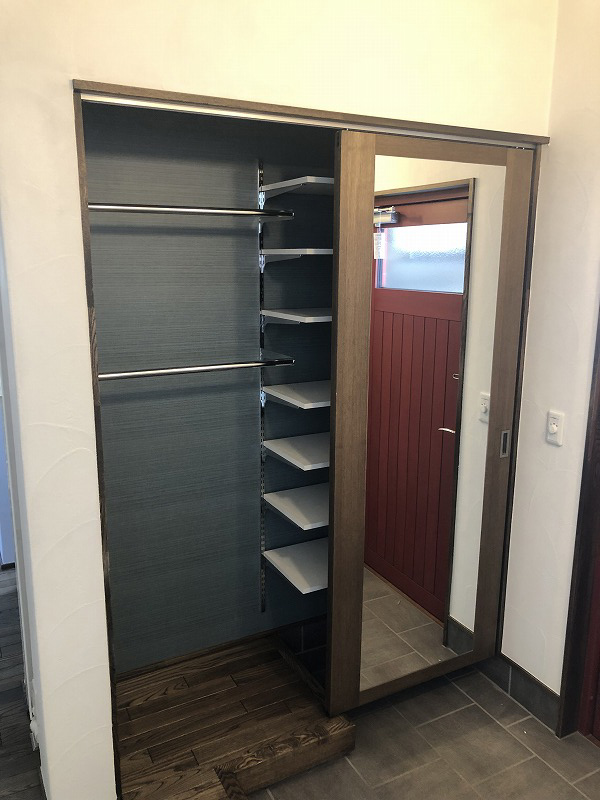 お出かけ前の身だしなみ確認が出来るように、扉には鏡を取り付けました。