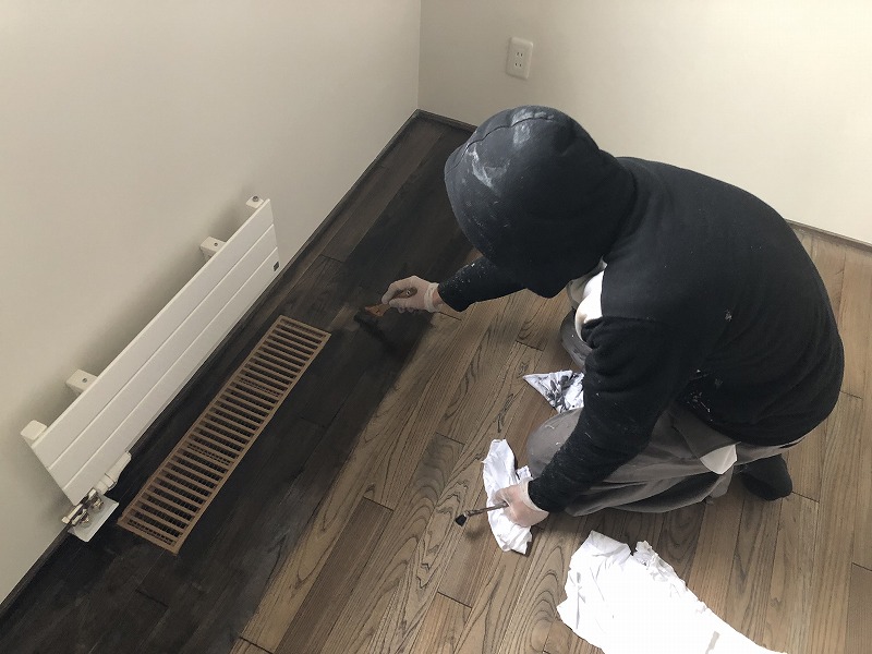 内部の工事も最後となり、塗装屋さんが床の仕上塗装をして行きます。