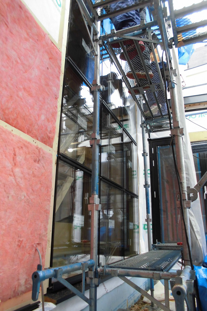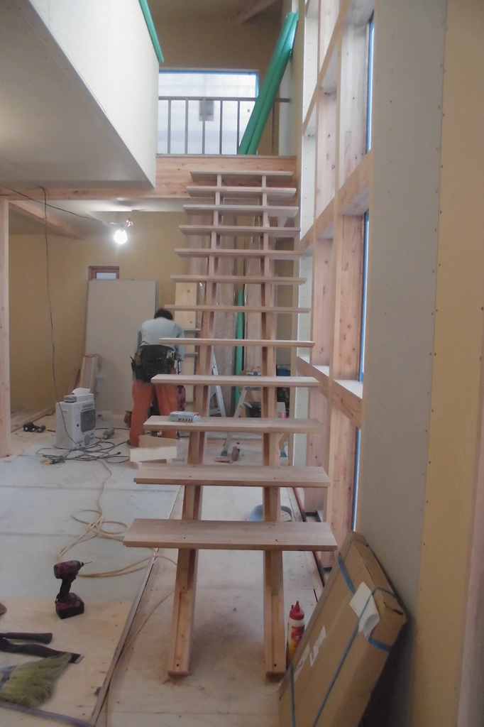 カーテンウォールの前に、ど~んっ!!と2階から1階にわたされた木材は、階段のささら桁です。