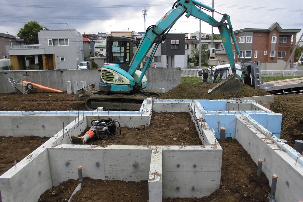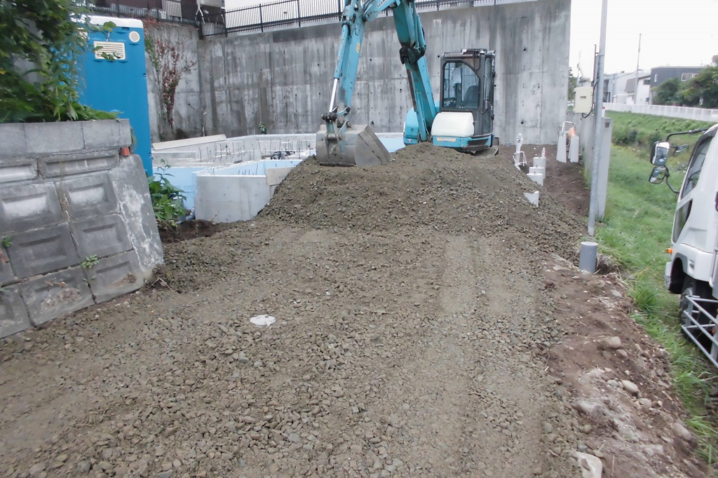 基礎の中や外周部の埋め戻し作業が始まりました。