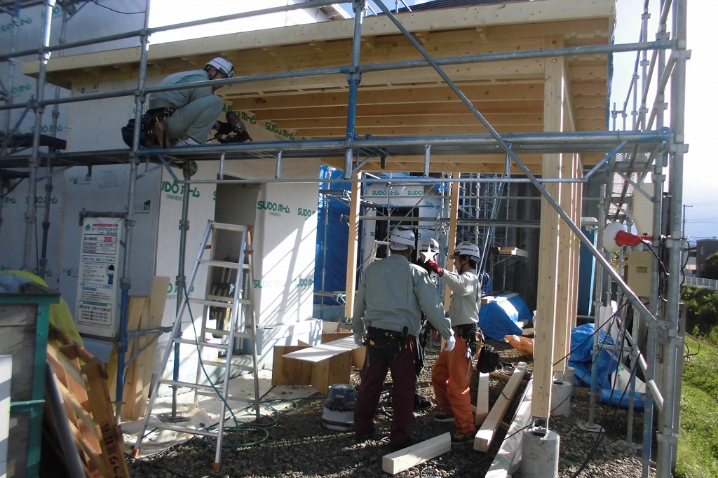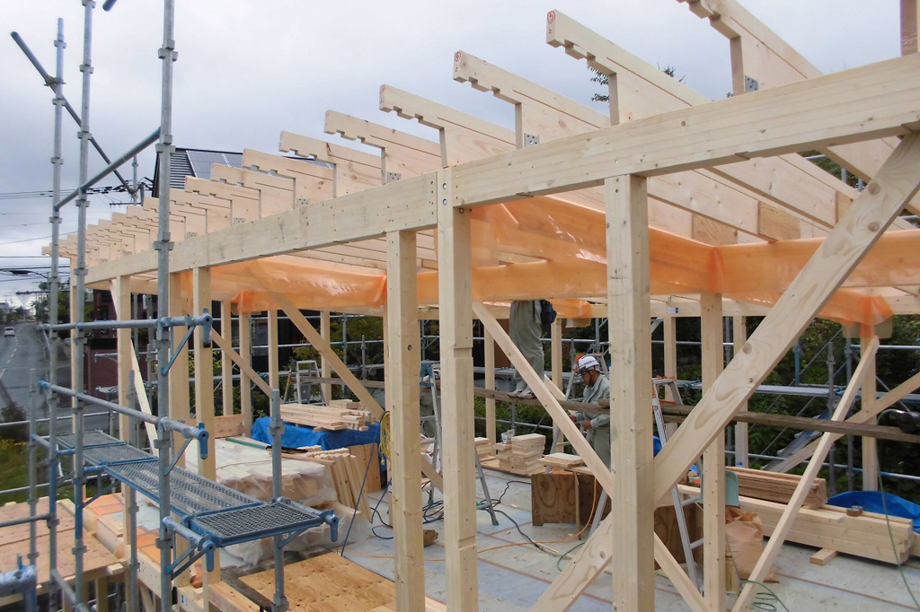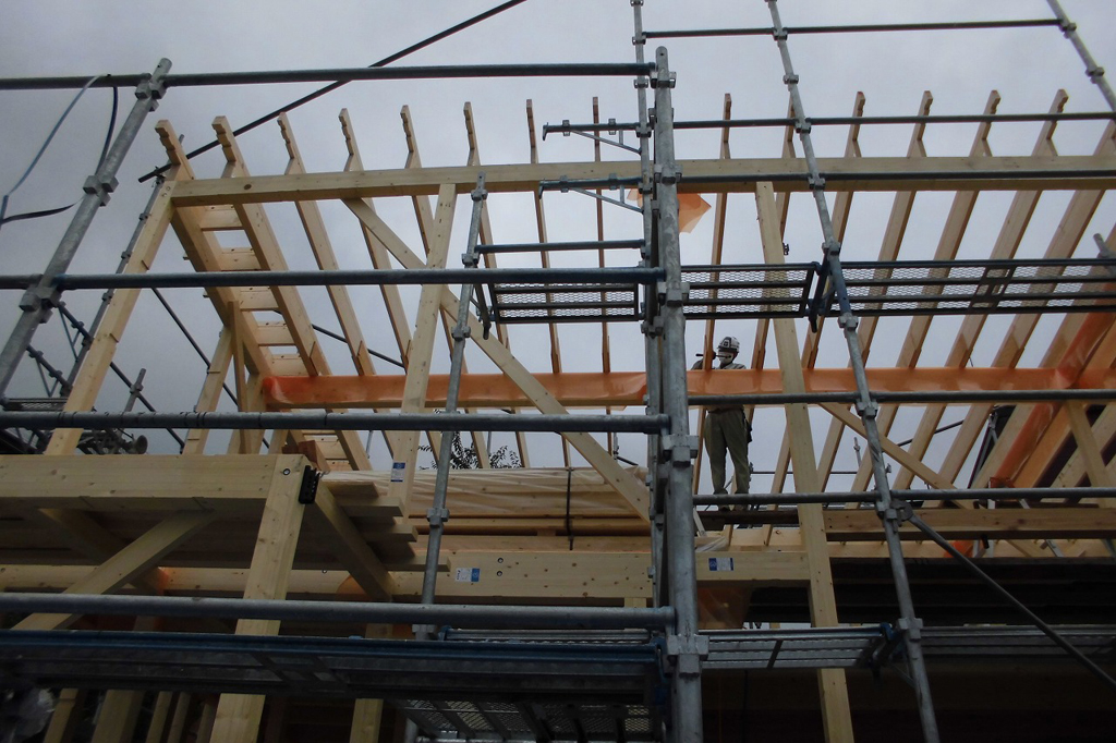 軸組みが組み上がり、屋根の垂木をかけている所です。