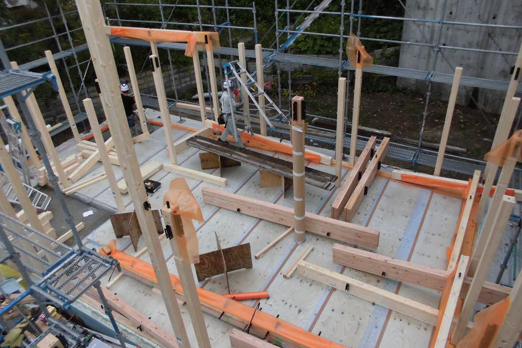 1階の柱が建てられて、2階床梁を掛けて行きます。迫力が出て来ました!!