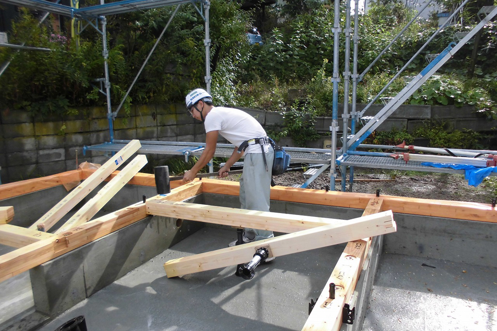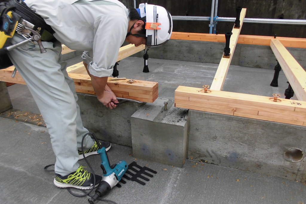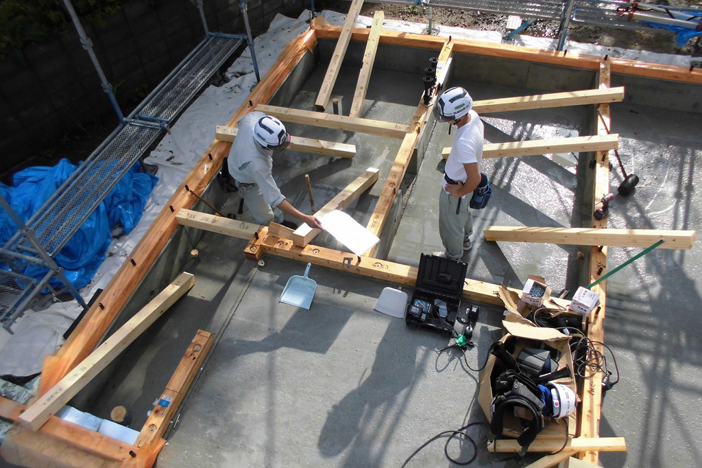 土台が敷き終わった部分から、T樫さんとY本君が図面を見ながら大引きの取付を行って行きます。