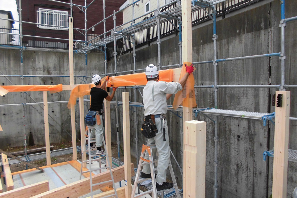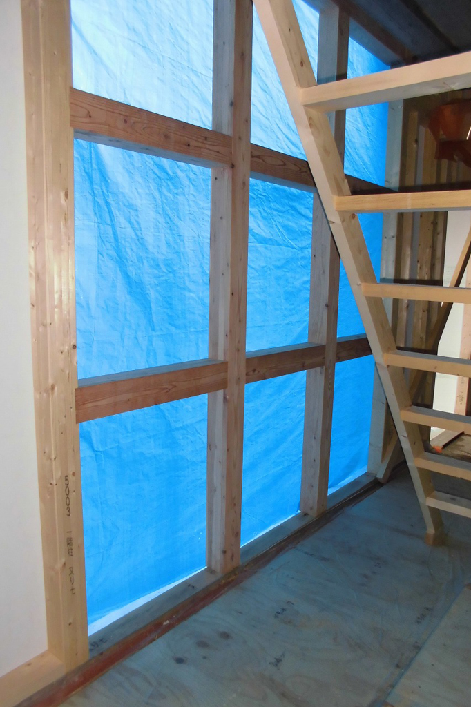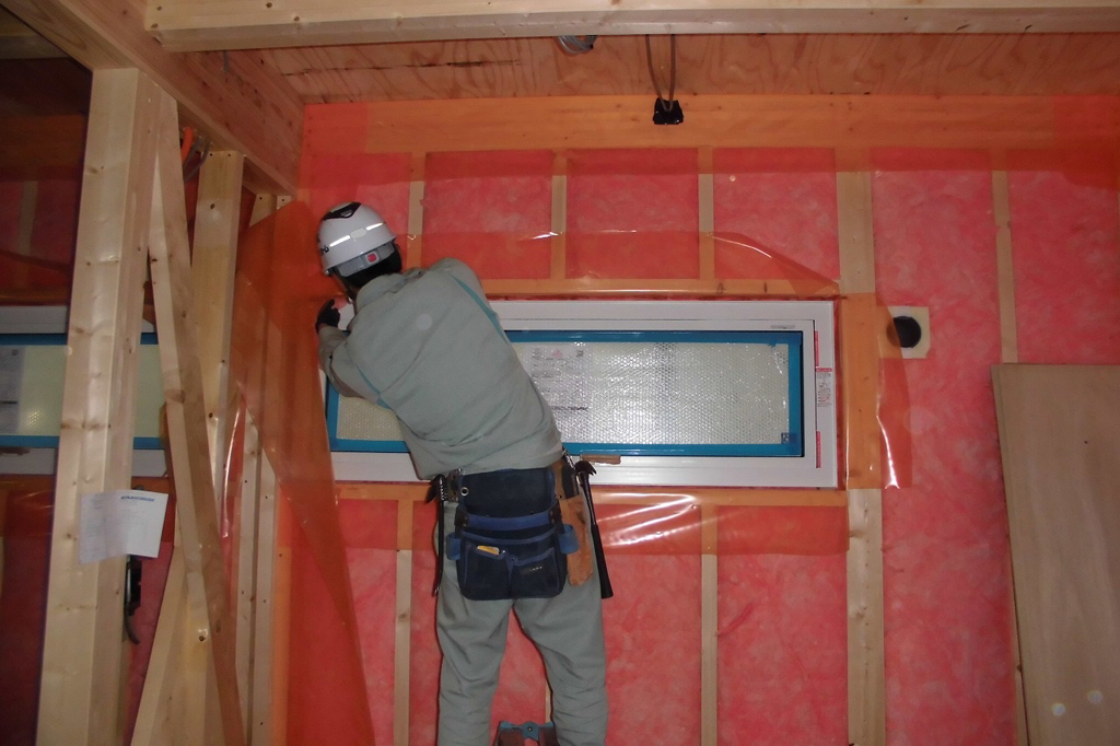 断熱材の施工が完了したら、気密シートの施工をして行きます。