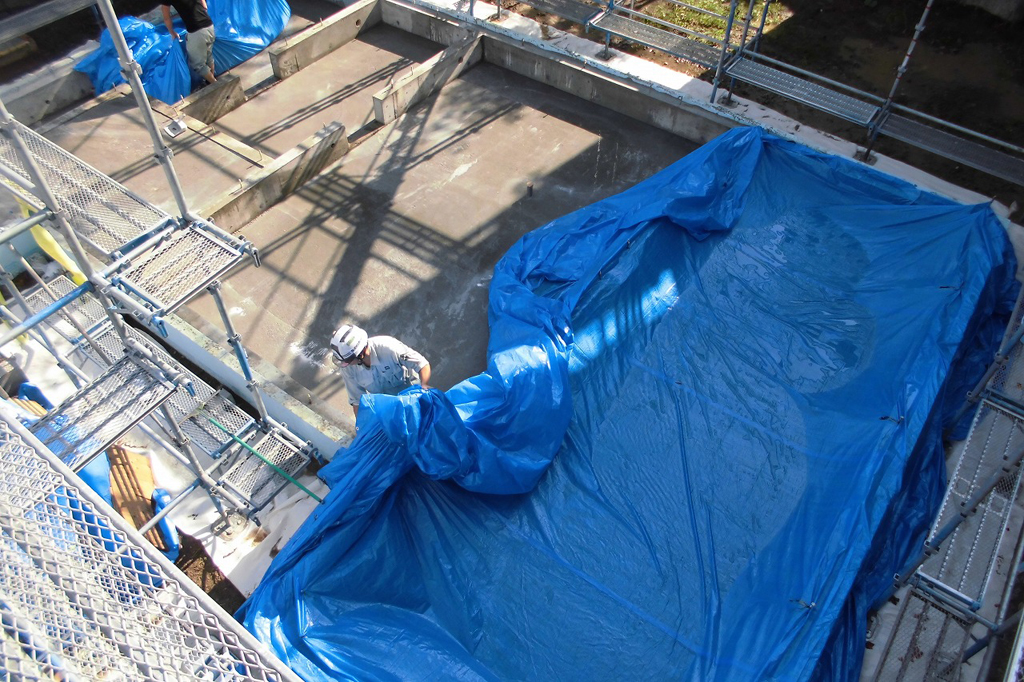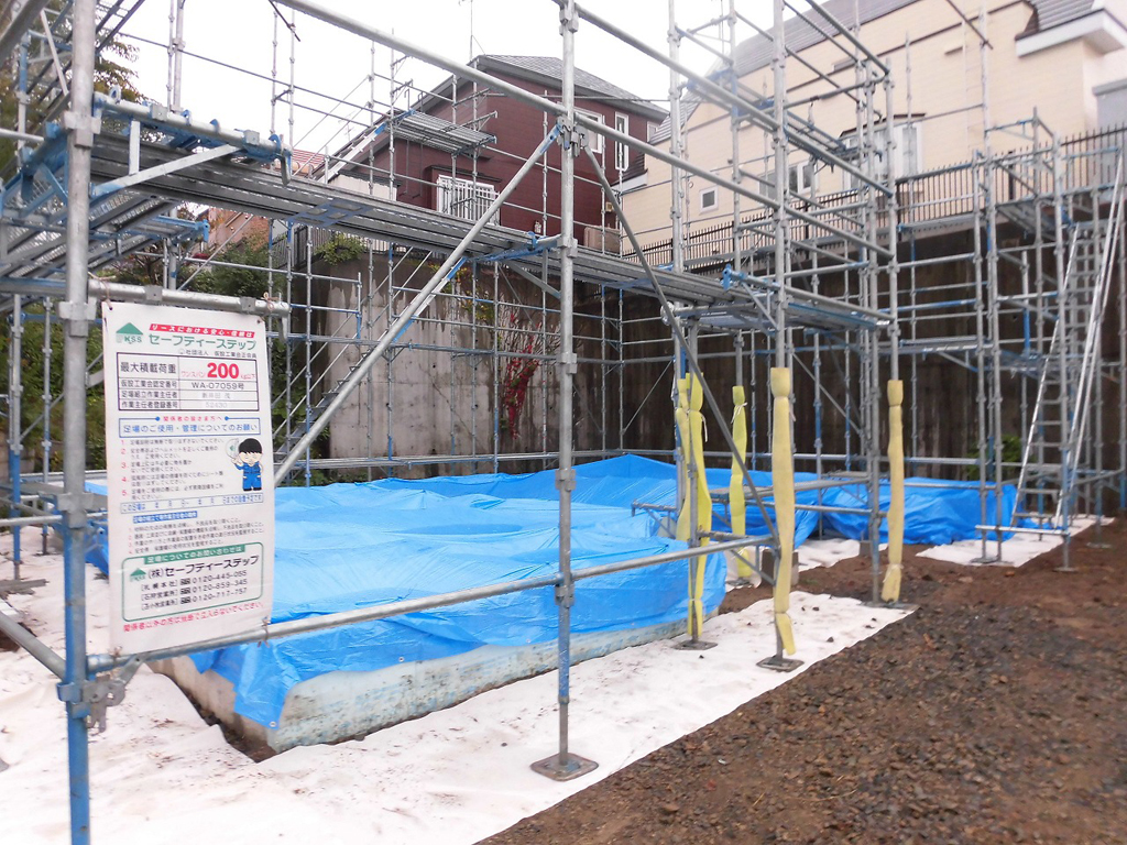 まずは、基礎工事中に掛けておいたブルーシートを剥がす作業から行います。