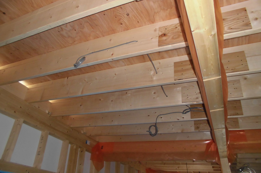 屋根の垂木間にも断熱材を充填し、垂木の下には付加断熱として更に断熱材を施工しています。
