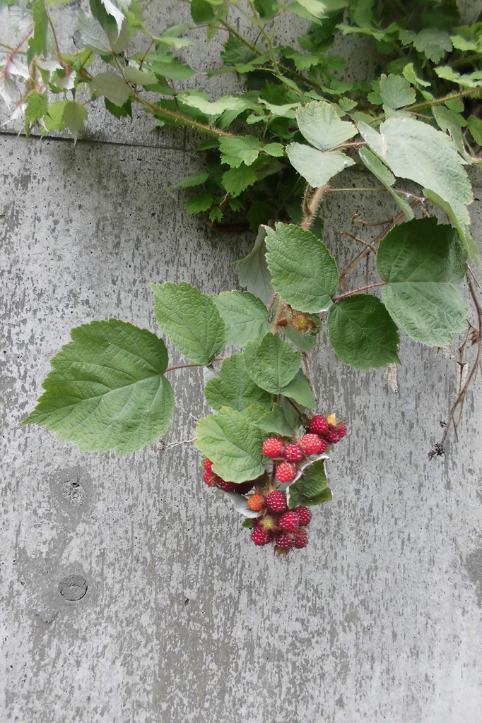 擁壁の水抜き穴からラズベリー??が生えて来ていました。