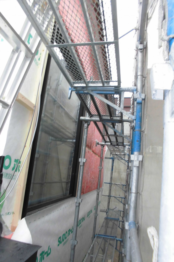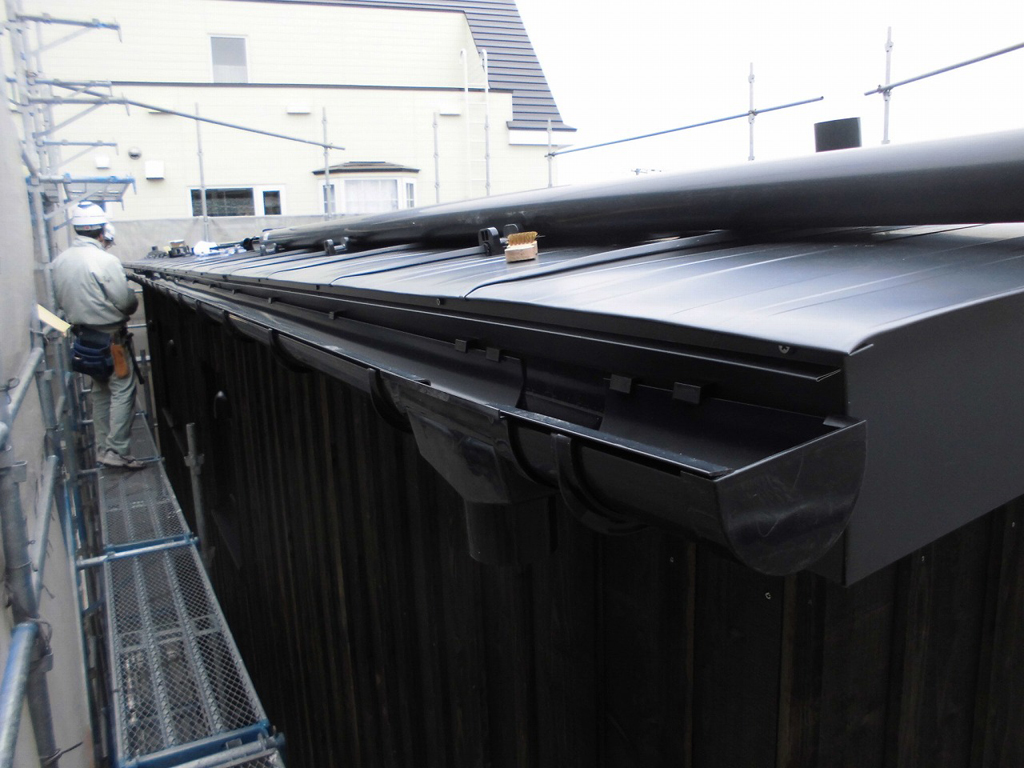 外部足場を解体する前に、各種器具付けと雨樋の取付を行います。
