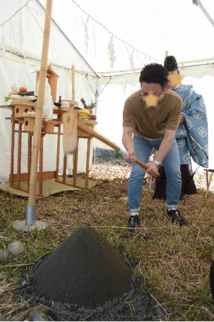 お施主様には、エイッエイッエイッという掛け声と共に鍬入れをして頂きます。