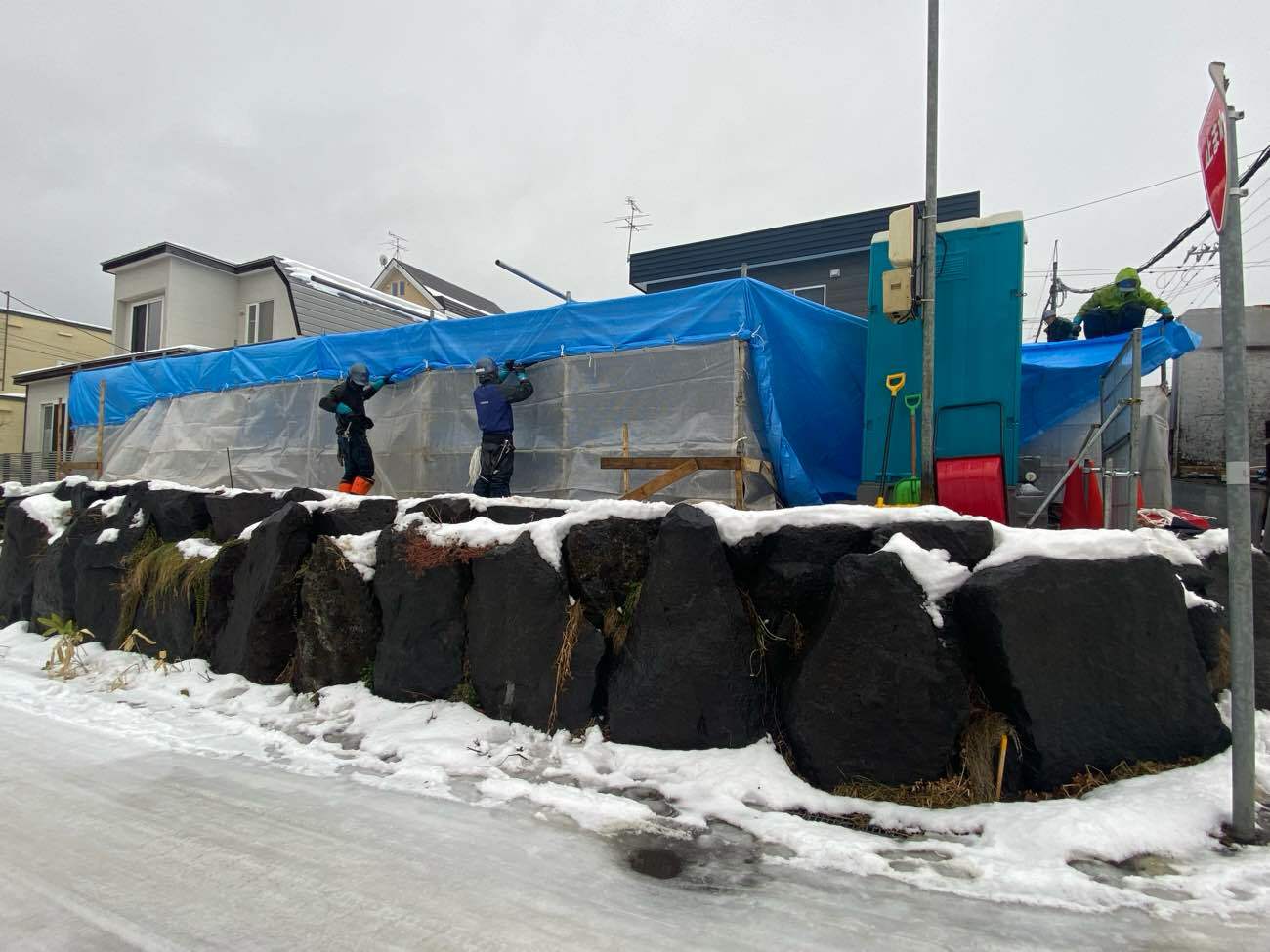冬の工事は雪や寒さからコンクリートを守るため、テントを施工します。