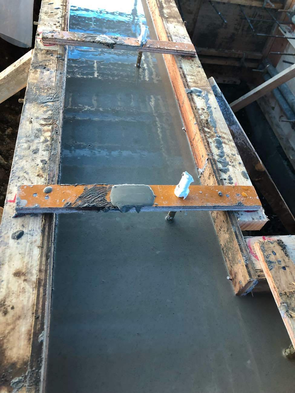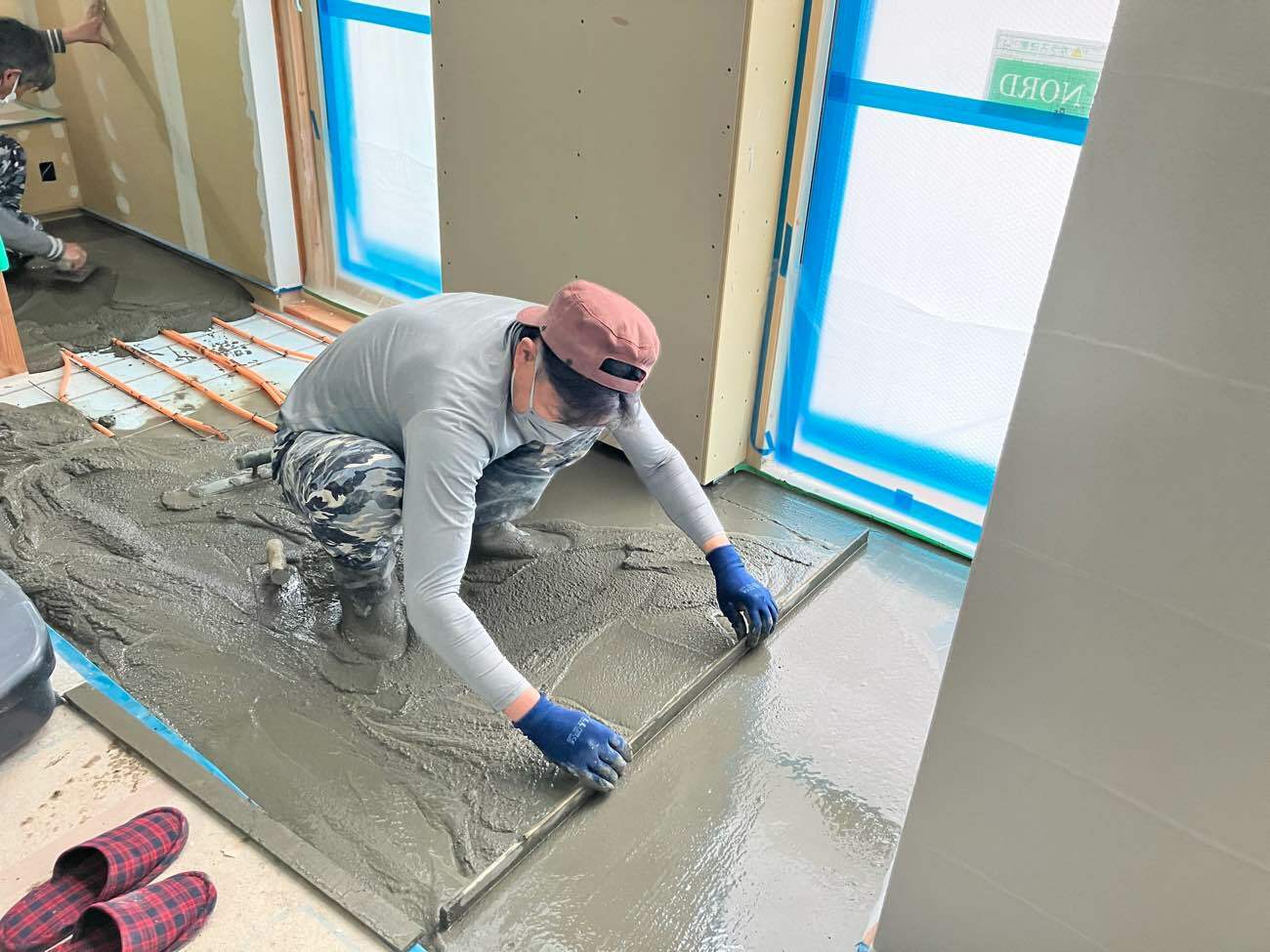 モルタルを流しつつ、職人さんが木材を使って均一に平して、綺麗な面にした状態で固まるのを待ちます。