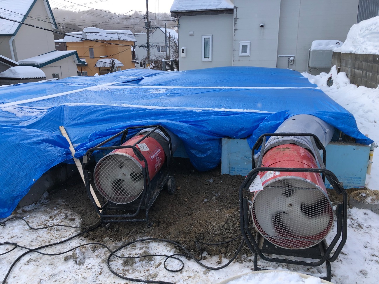 綺麗な面にした後、立ち上がりコンクリートの時と同様にブルーシートで養生し、ホットガンで寒さから守りつつ養生します。
