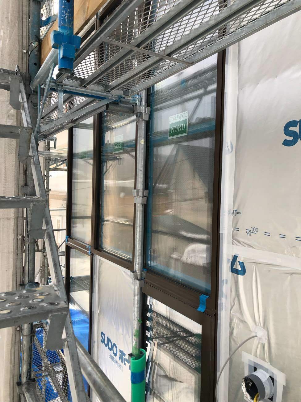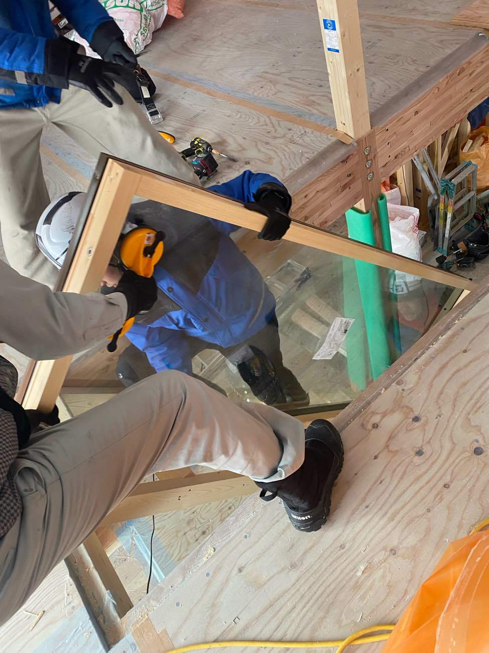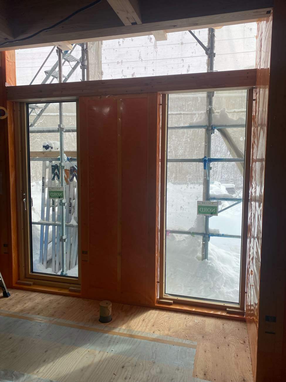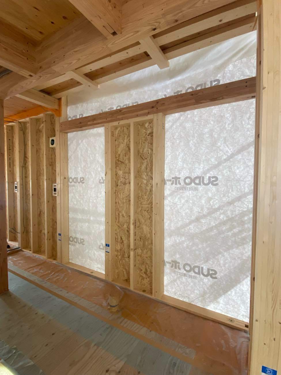 『大きい窓』の全貌が見えてきました。窓を取付する前なのでOSBの外側にはタイベックが貼ってあります。次回はワラッシー先輩が現場の様子をお伝えします。