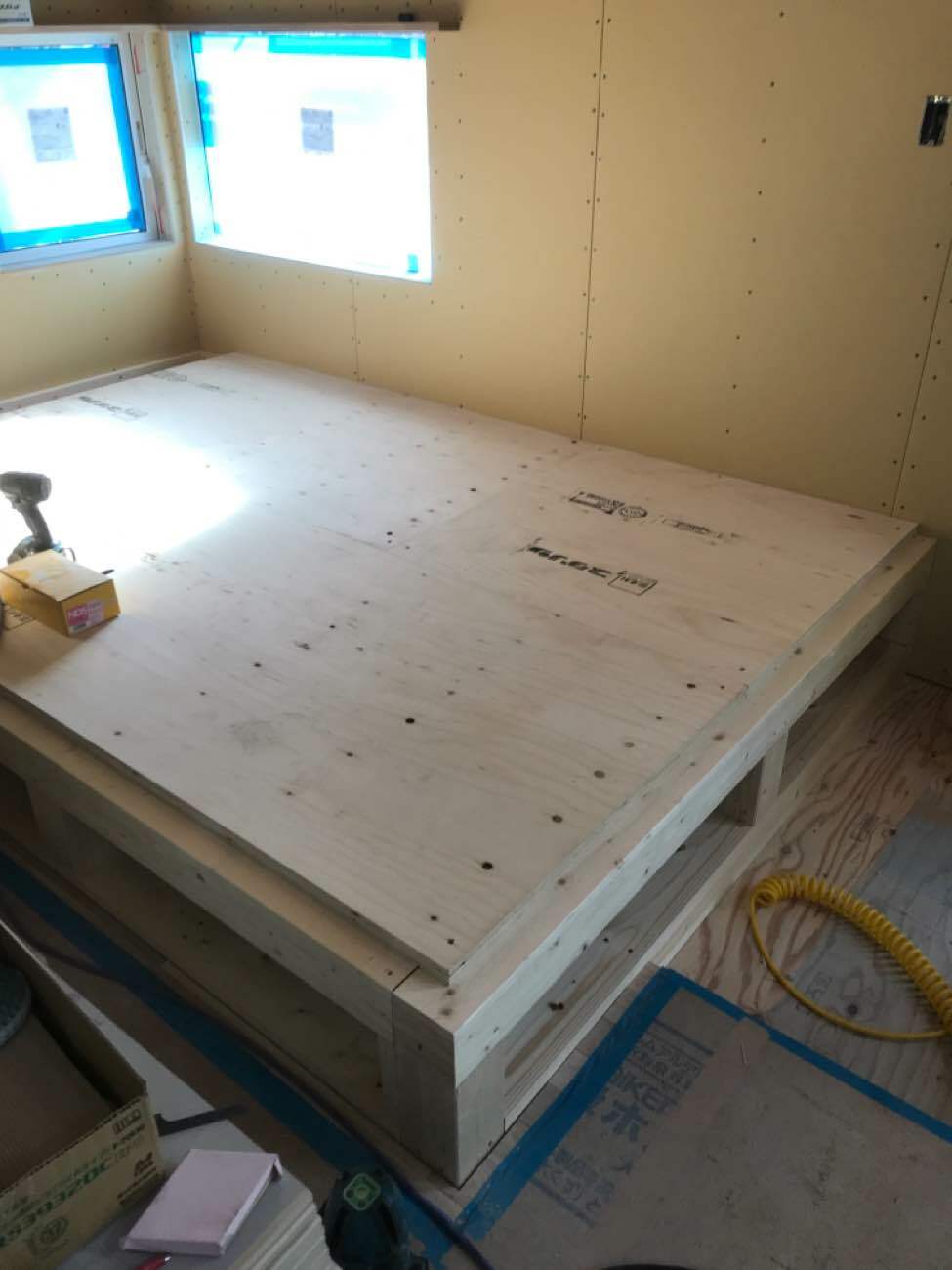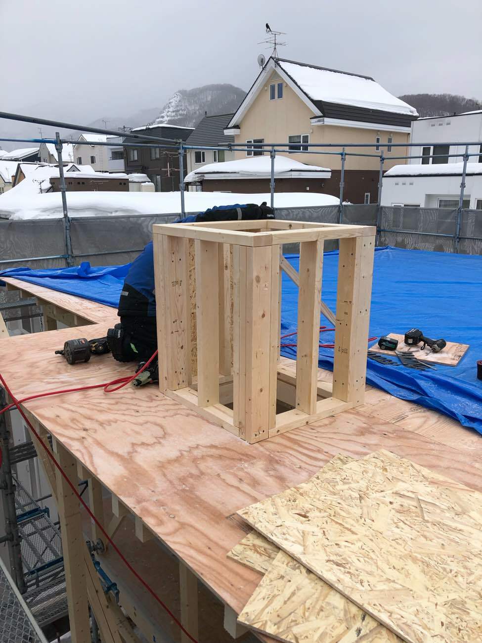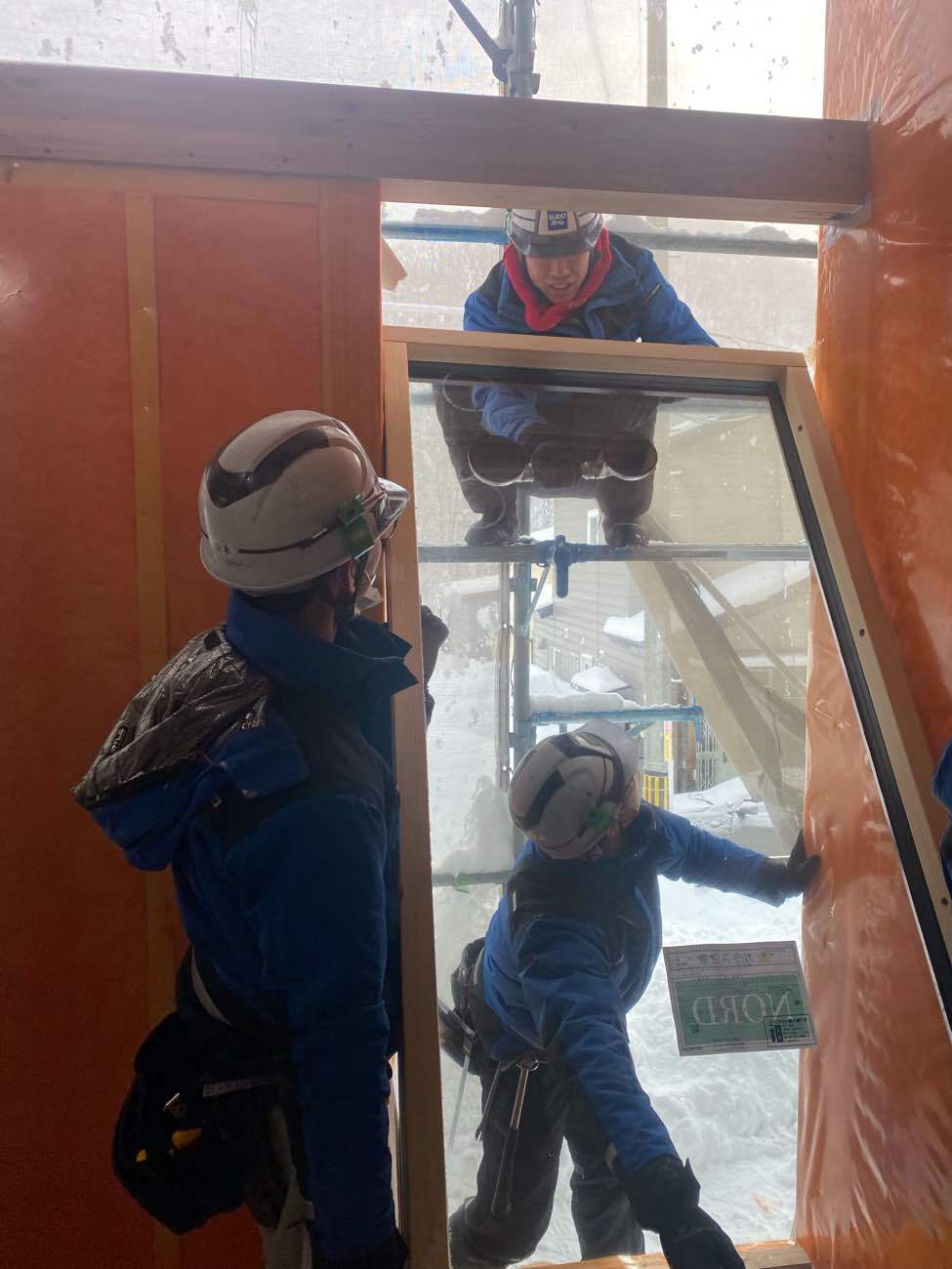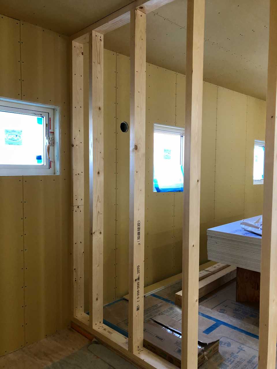 『大きい窓』の全貌が見えてきました。窓を取付する前なのでOSBの外側にはタイベックが貼ってあります。次回はワラッシー先輩が現場の様子をお伝えします。