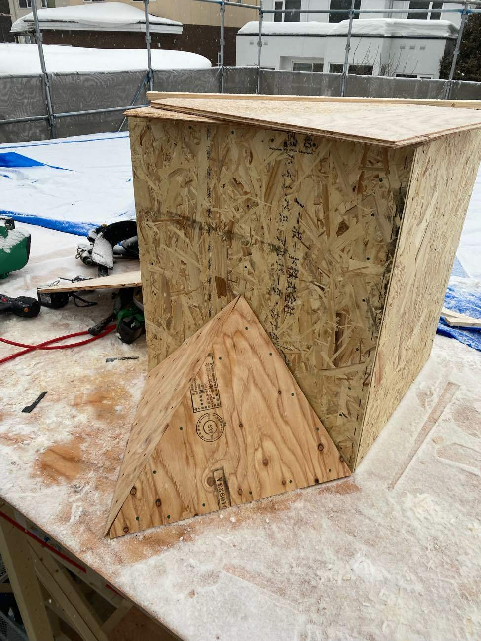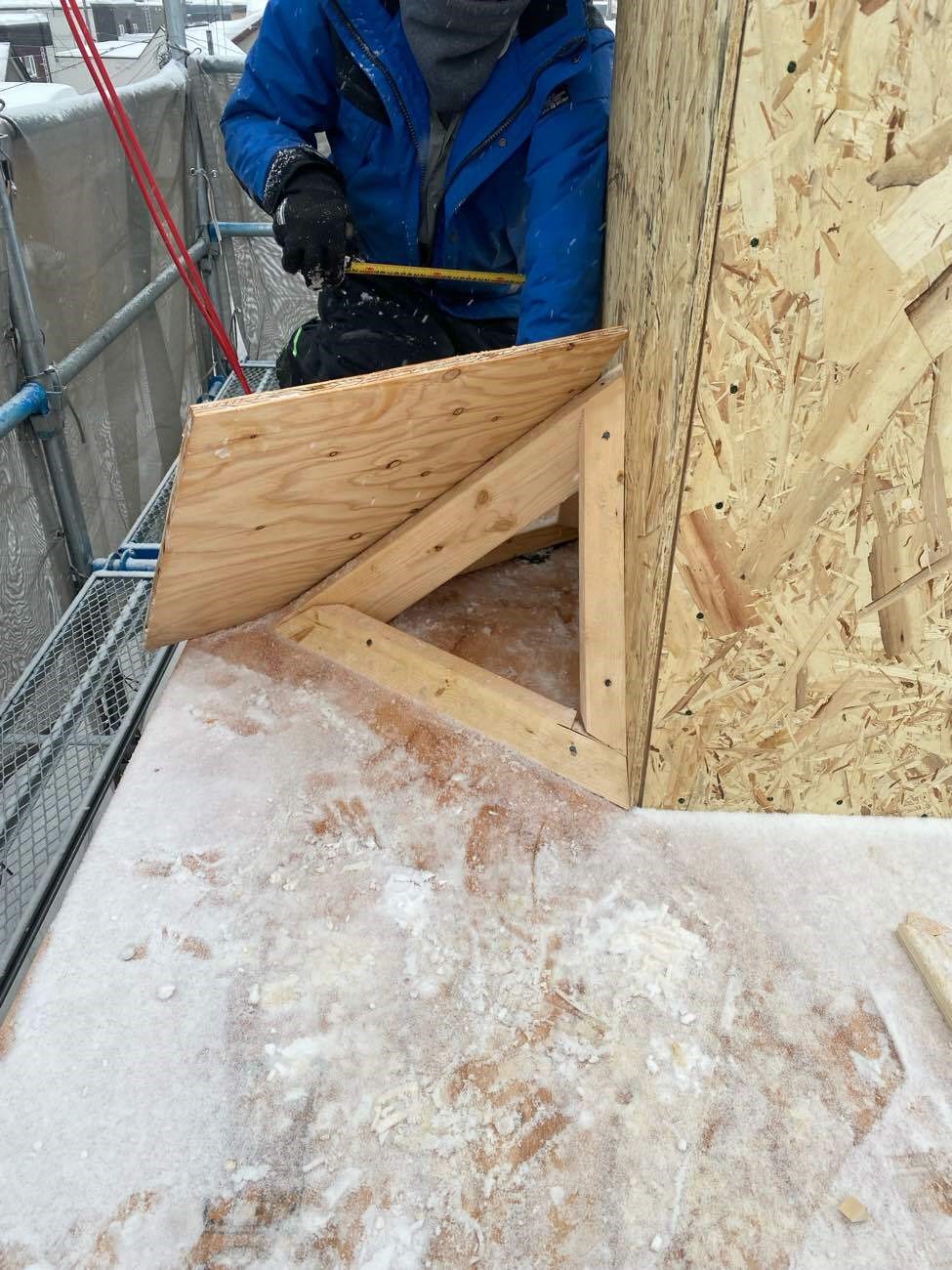 そのため、積もった雪が左右に割れるように「雪割り」を施工します。