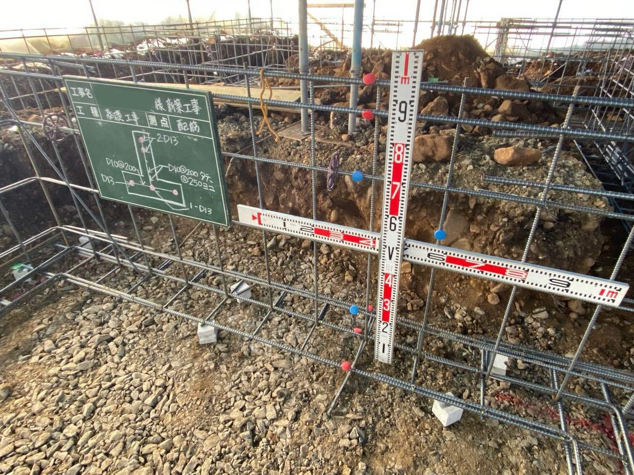 配筋が完了したら、クロスロットという標尺とマグネットを用いて、図面と同じ配筋になっているか、自主検査を行っています。赤いマグネットが13mm、青いマグネットが10mmの鉄筋です。間隔も均一で図面の通りでした!!