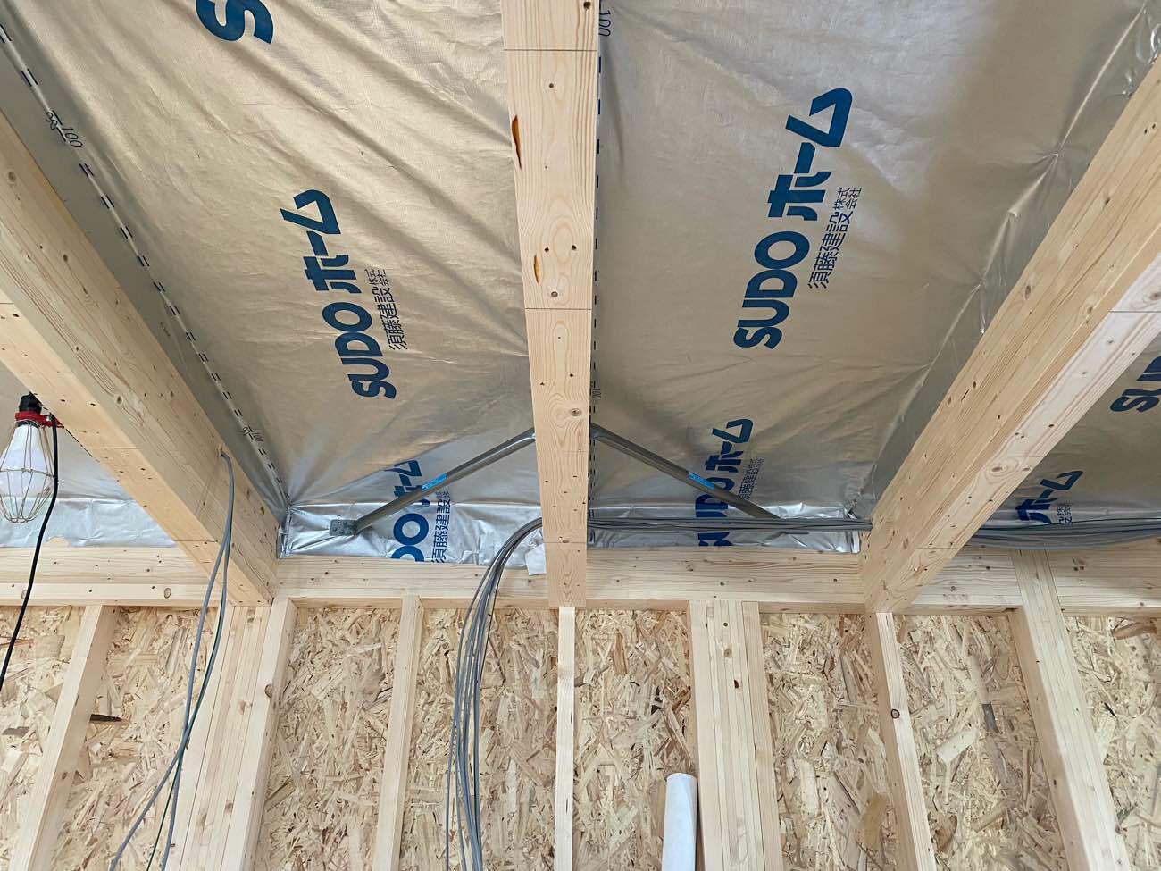 2階の天井にはタイベックを施工します。透湿防水シートと言われるタイベックを貼ることで、