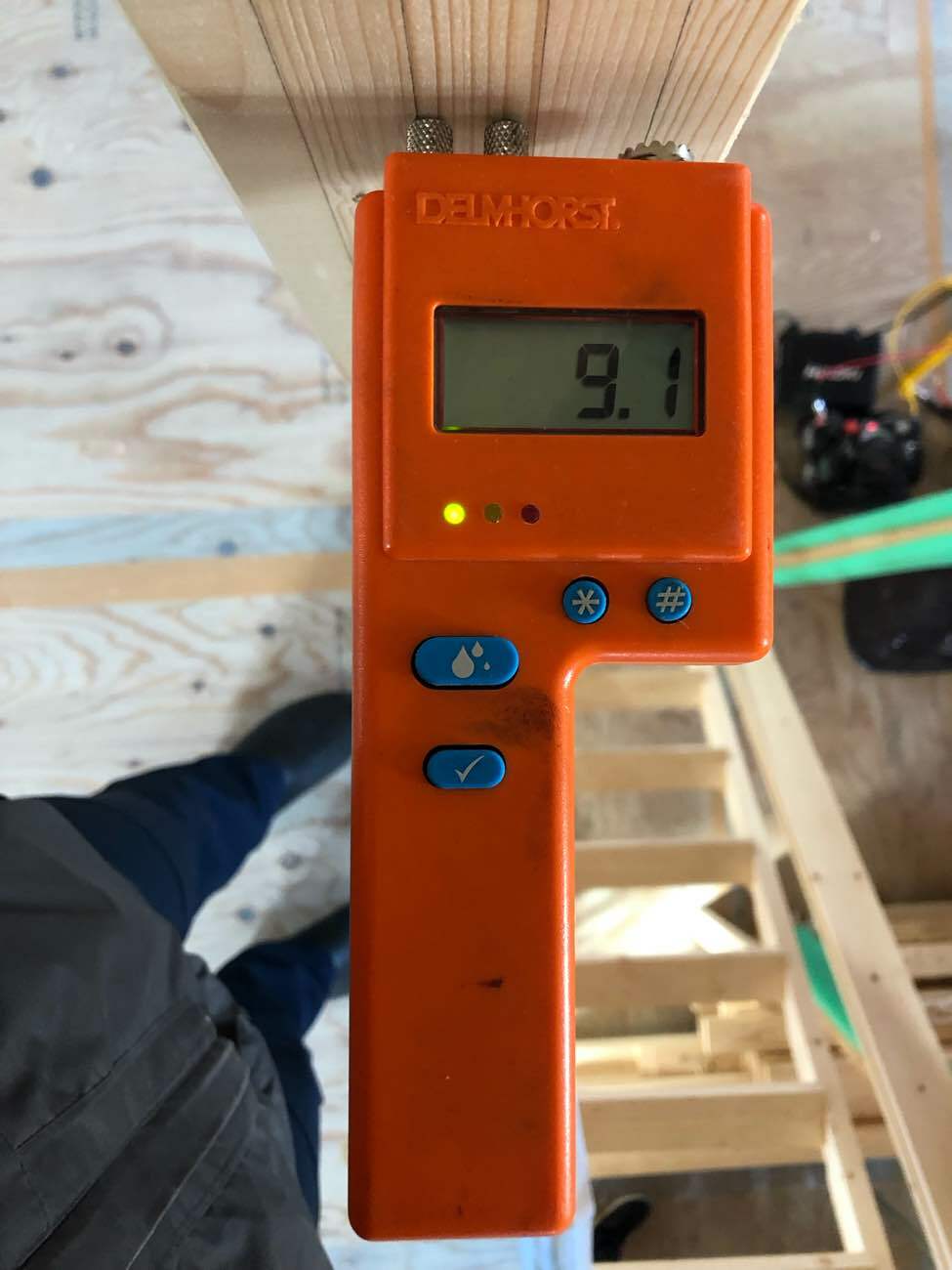 また、地震や台風などの災害で起こりうる水平方向の変形の防止に「火打ち梁」の役割をする金物も施工しています。まだ躯体が見えているうちに、含水率計測を行っていきます!