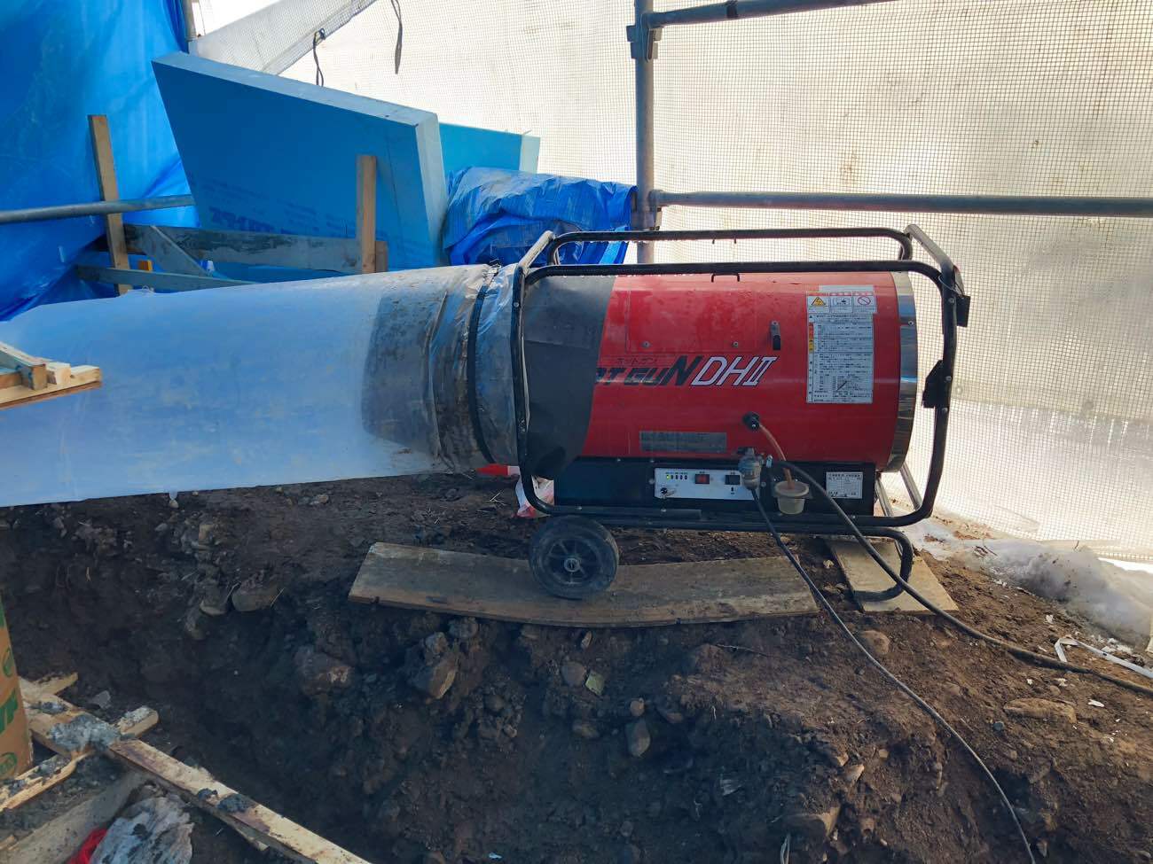 ホットガンという熱風ヒーターがつながっていて、テント内の温度が5℃以下にならないように保ちます。