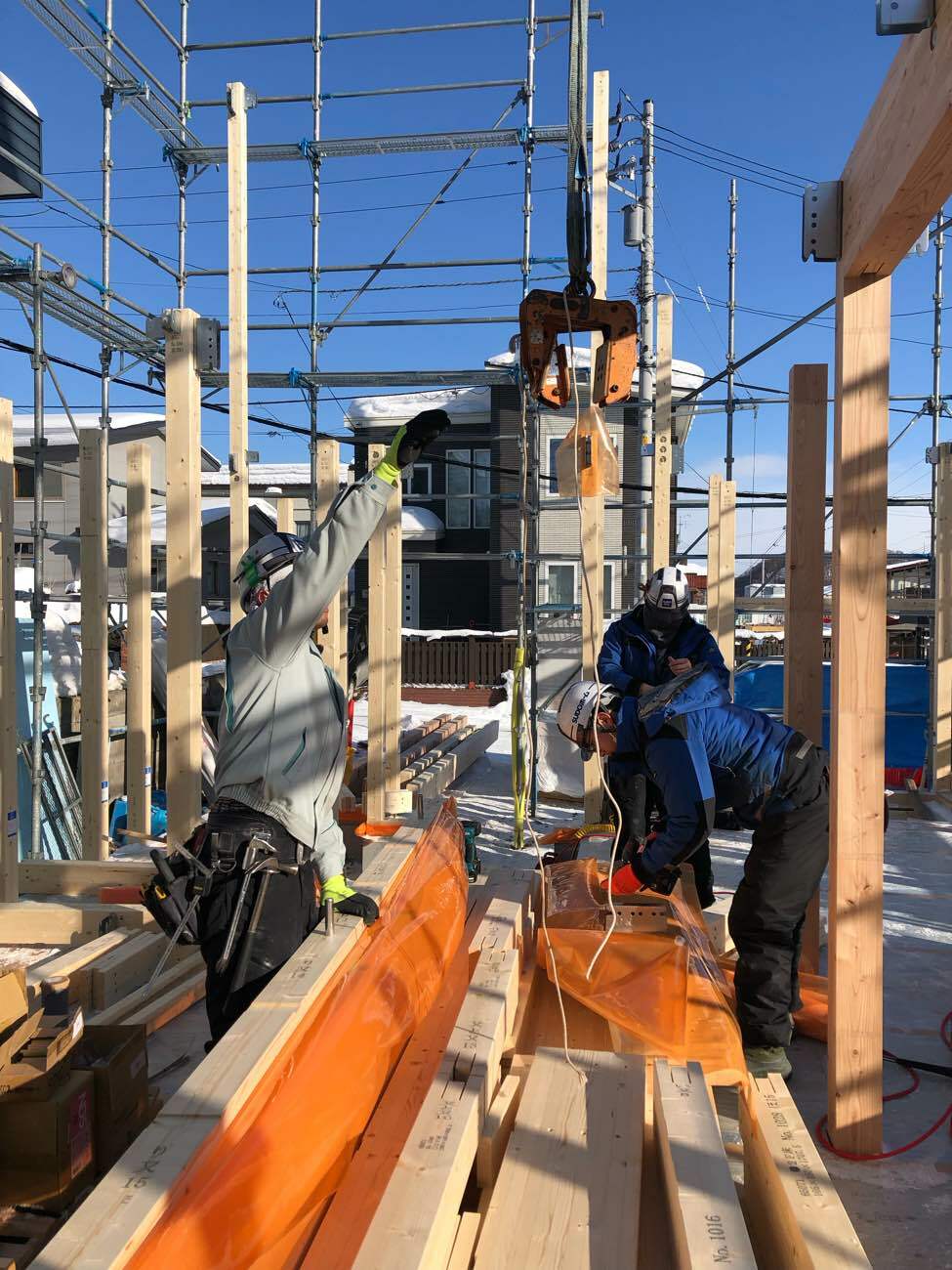 柱と梁を連結させる金物と気密シートを先に張ってから、クレーンを使って持ち上げます。