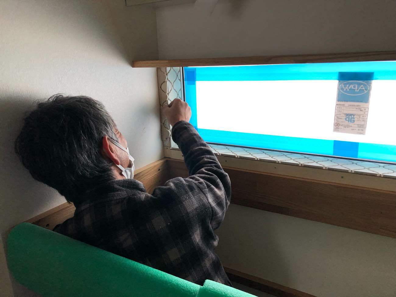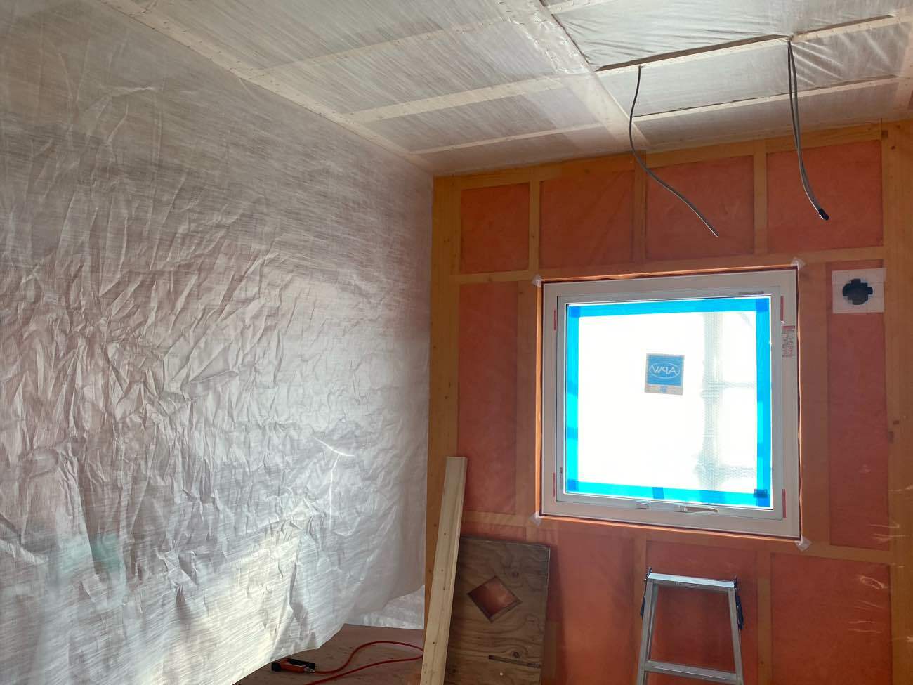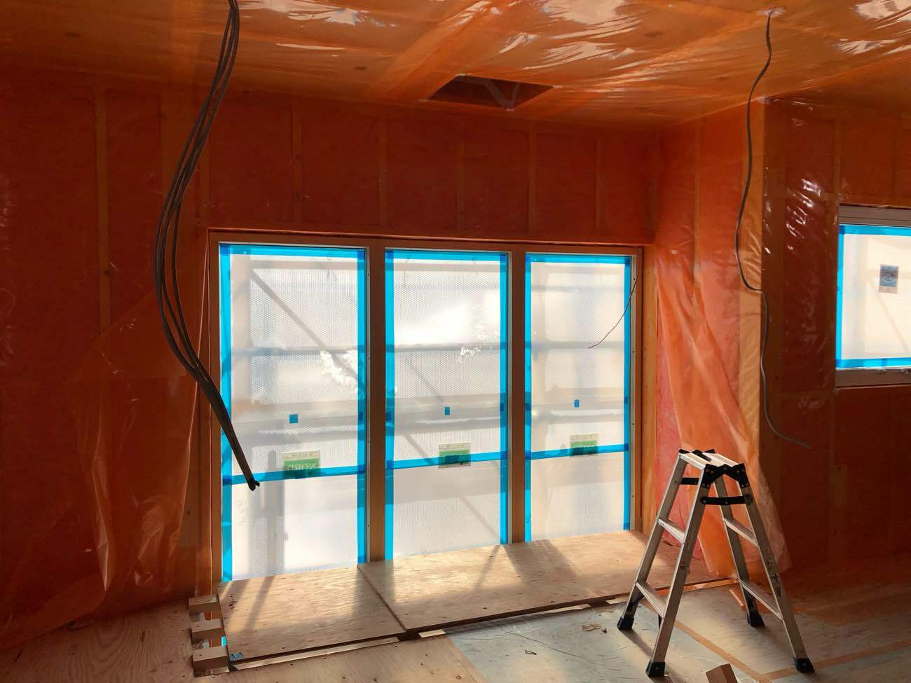 1・2階とも張り終えたら窓を取り付け、同時に窓周りに気密シートを先張りしておきます。