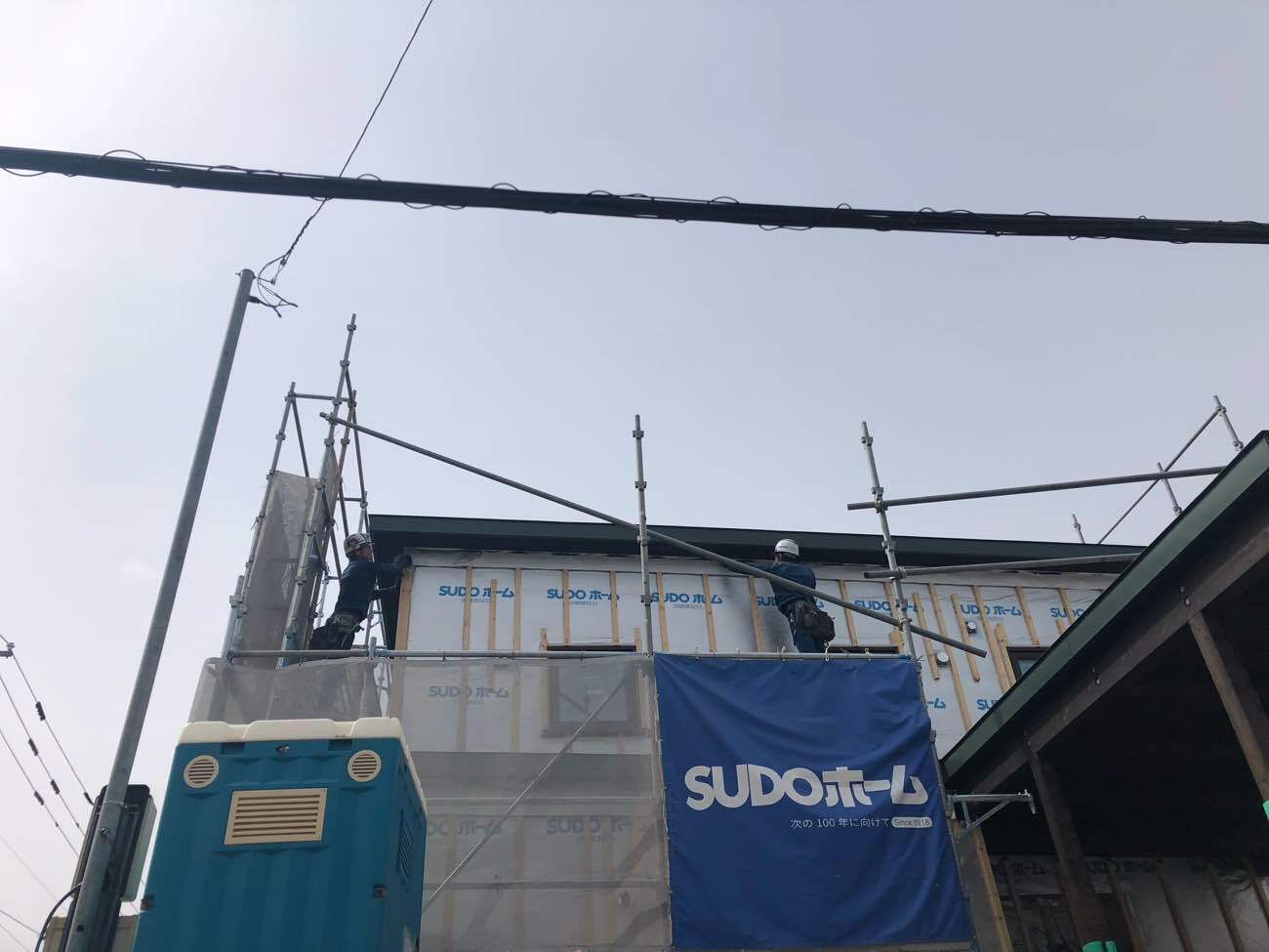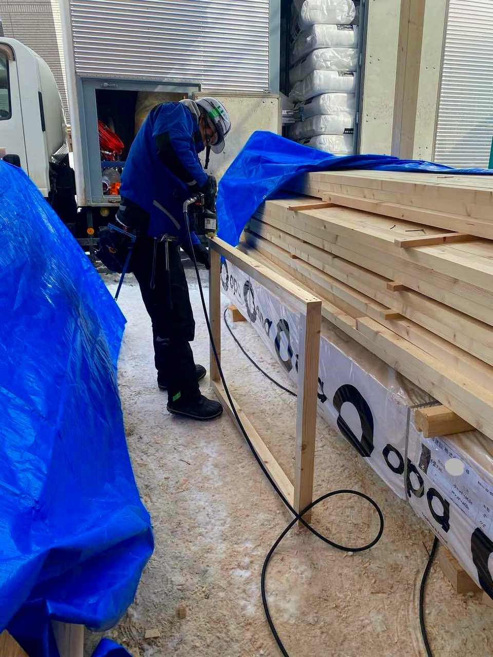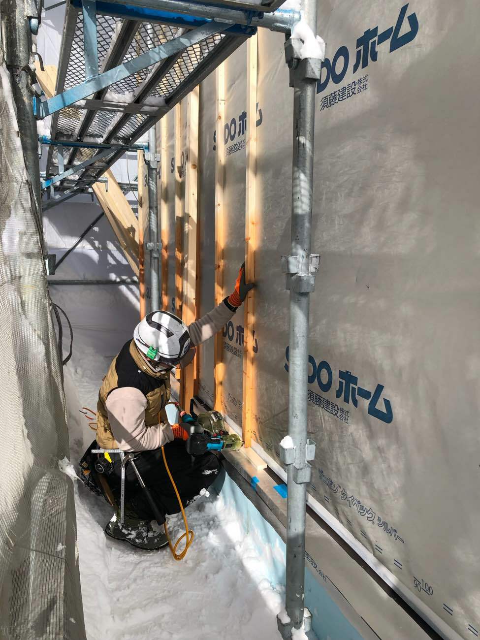 その頃、外部でも壁の付加断熱の施工準備が行われていました。