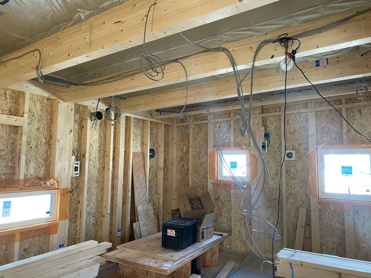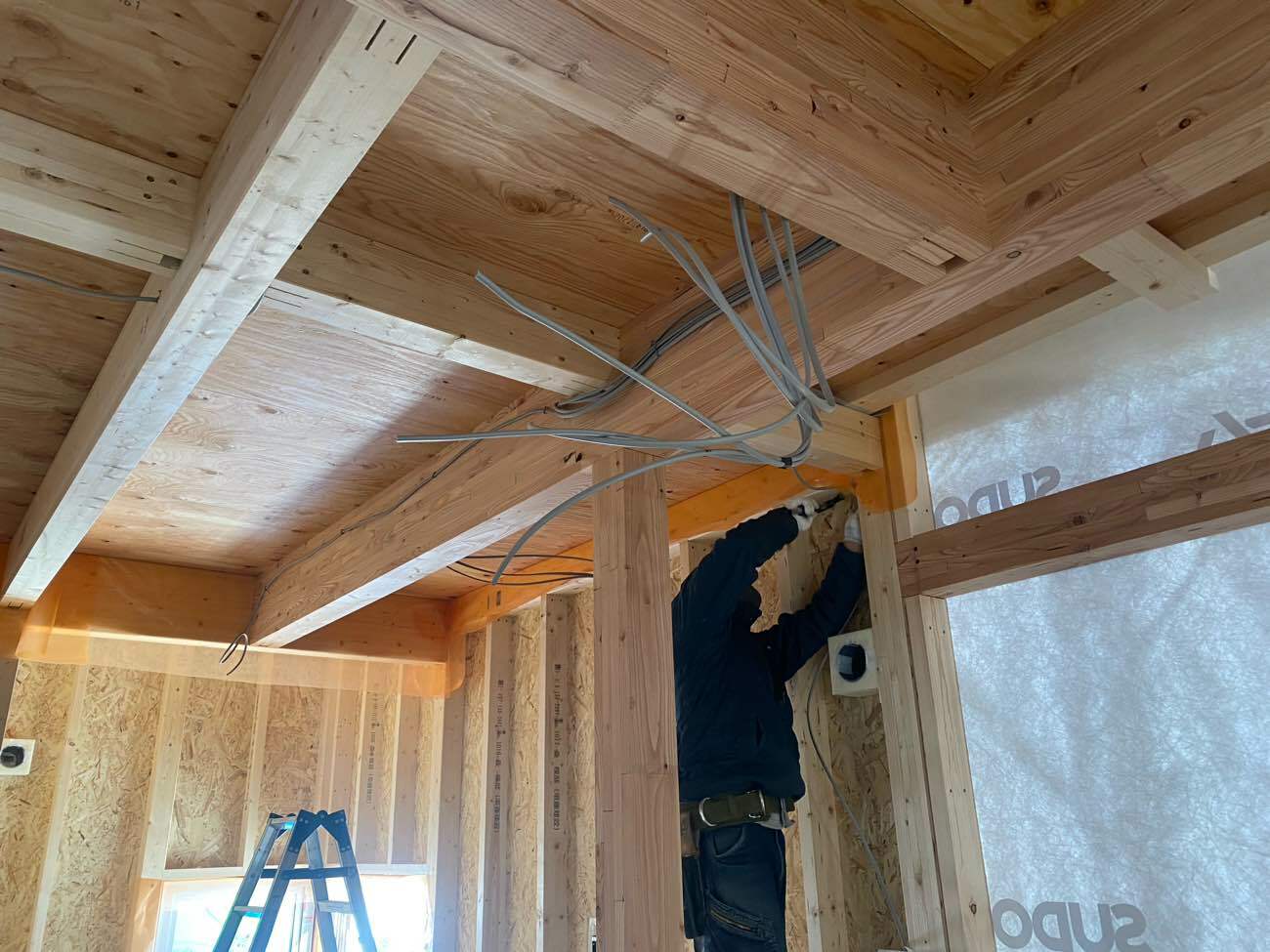 配線を梁の側面に這わせながら、照明器具やスイッチ、コンセントの位置まで施工しています。