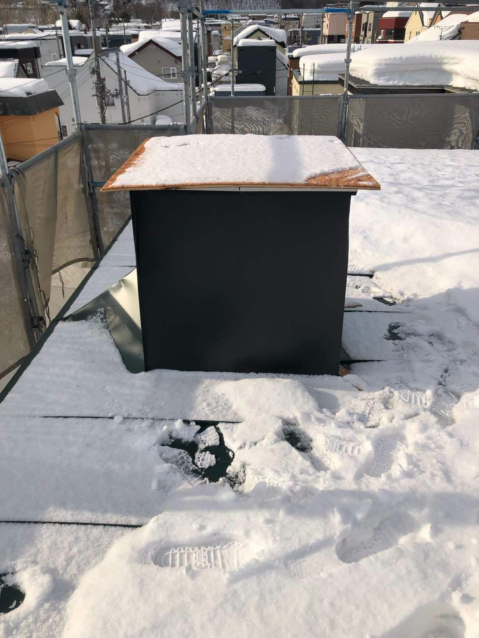写真の△の部分は、「雪割り」というものです。煙突の水上側は、「谷」になってしまうので、雪や雨が溜まりやすいです。