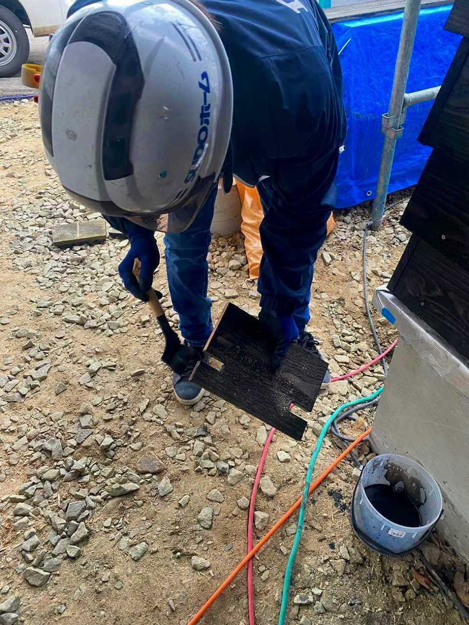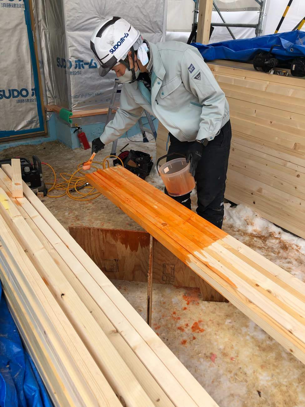 切り口は木酢液を塗って、抜け目なく張っていきます。内部はというと、