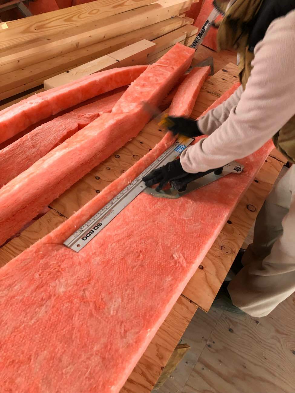 グラスウールを各場所に配置したら、今度は柱・間柱間に丁寧に入れていきます。
