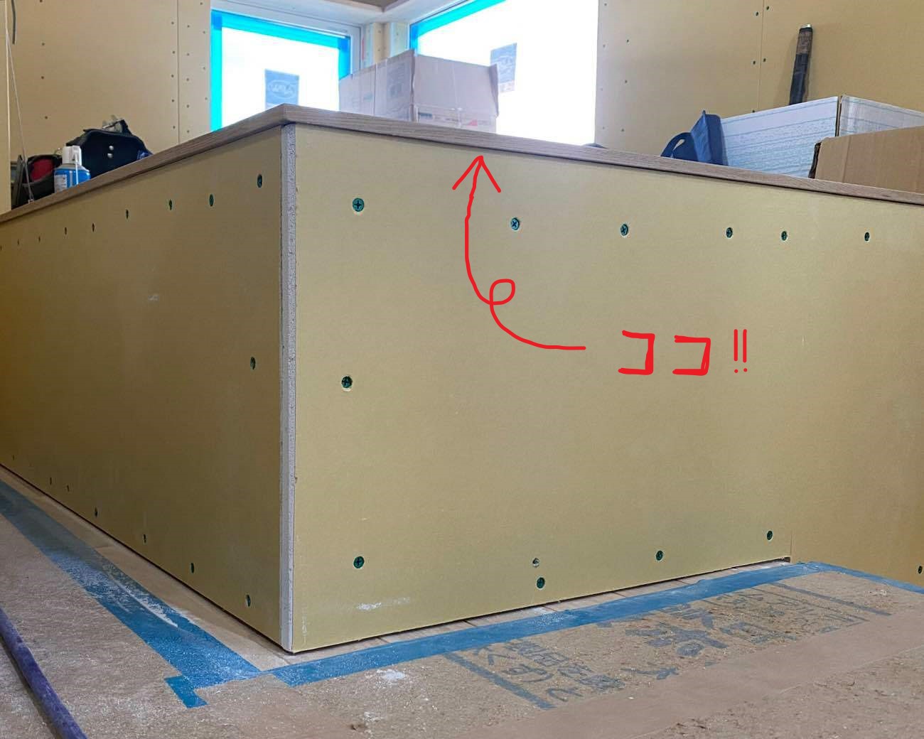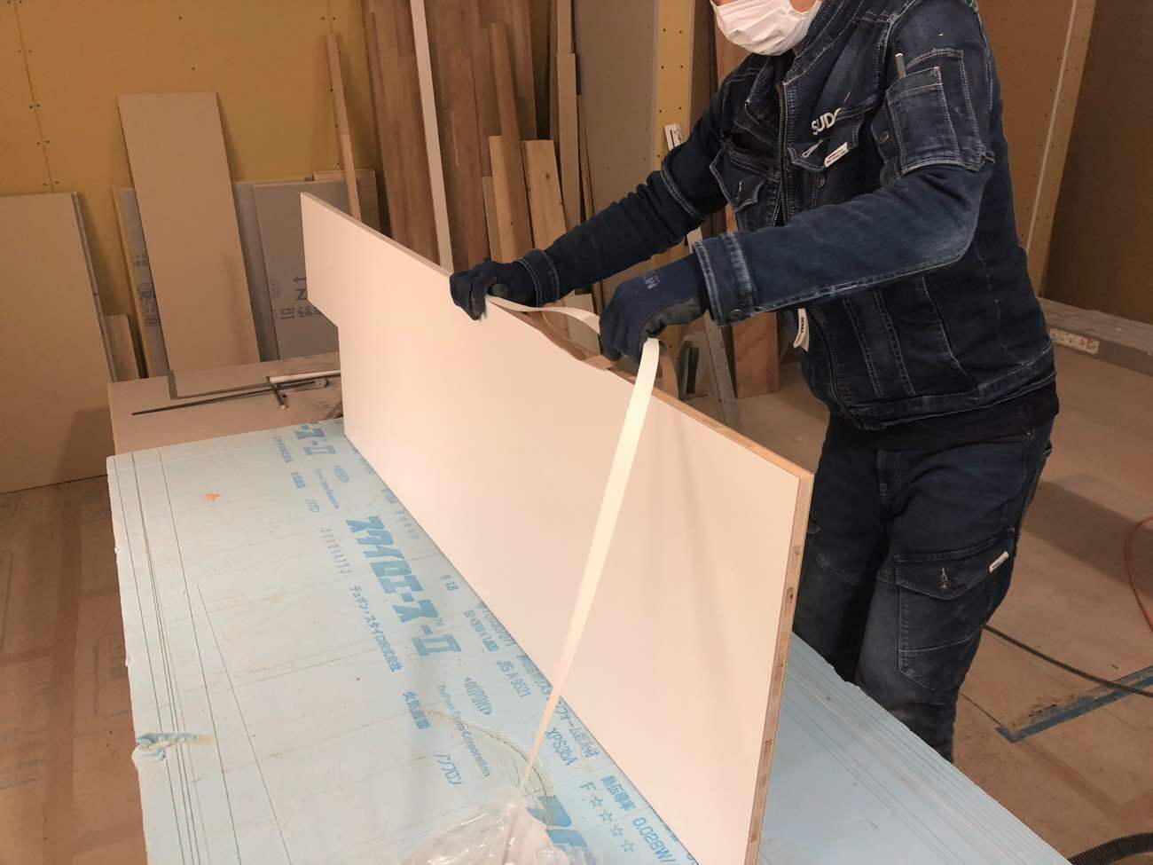 できた枠に乗せる天板も現場で合わせながらカットして、切り口に同じ色のテープを貼っています。