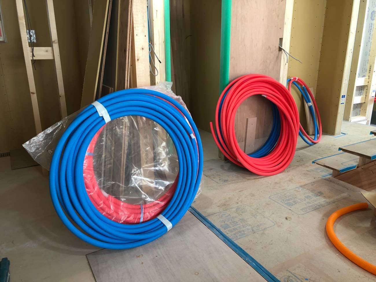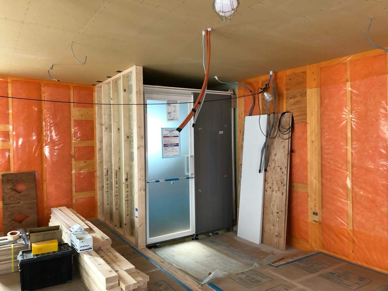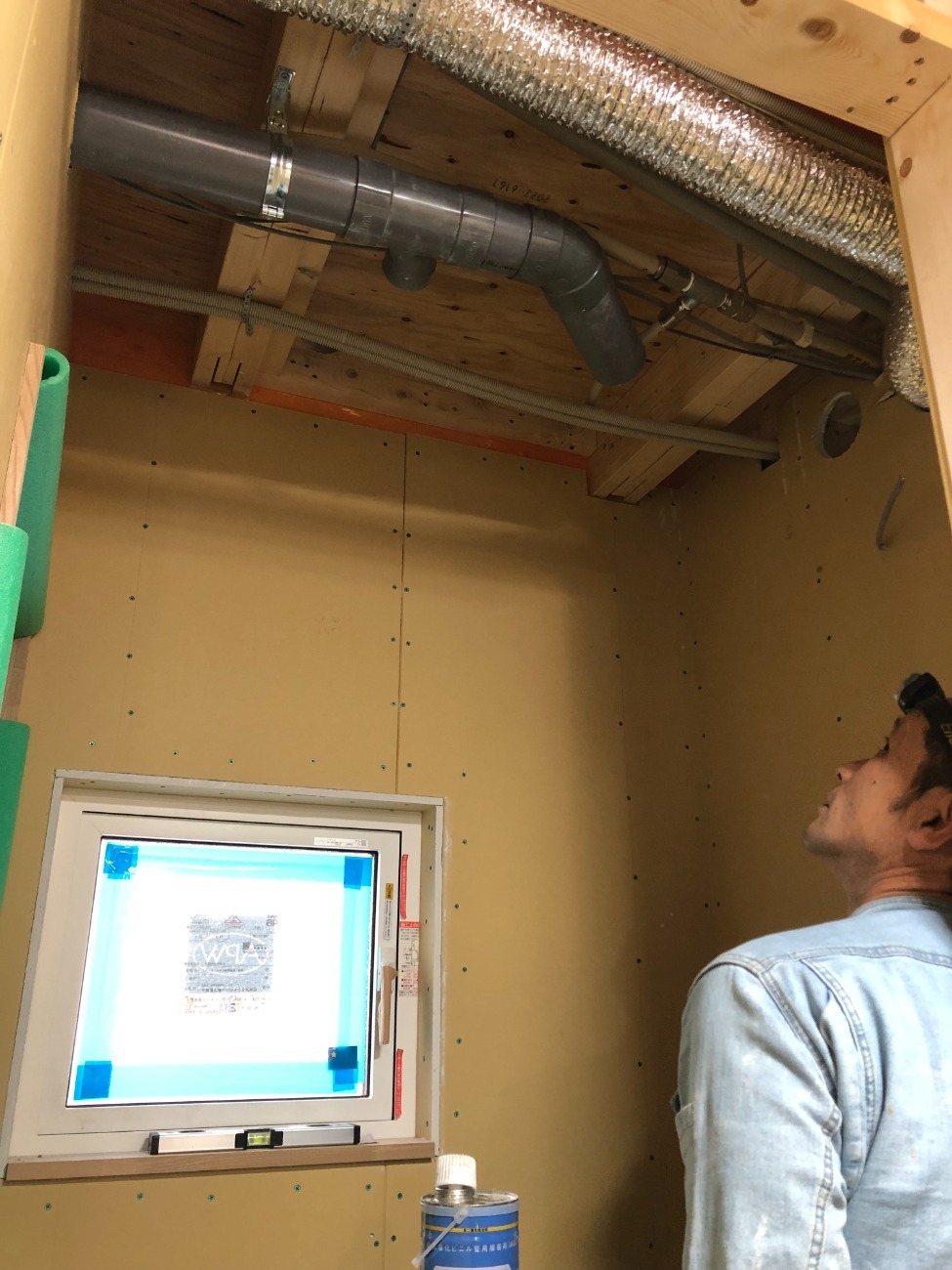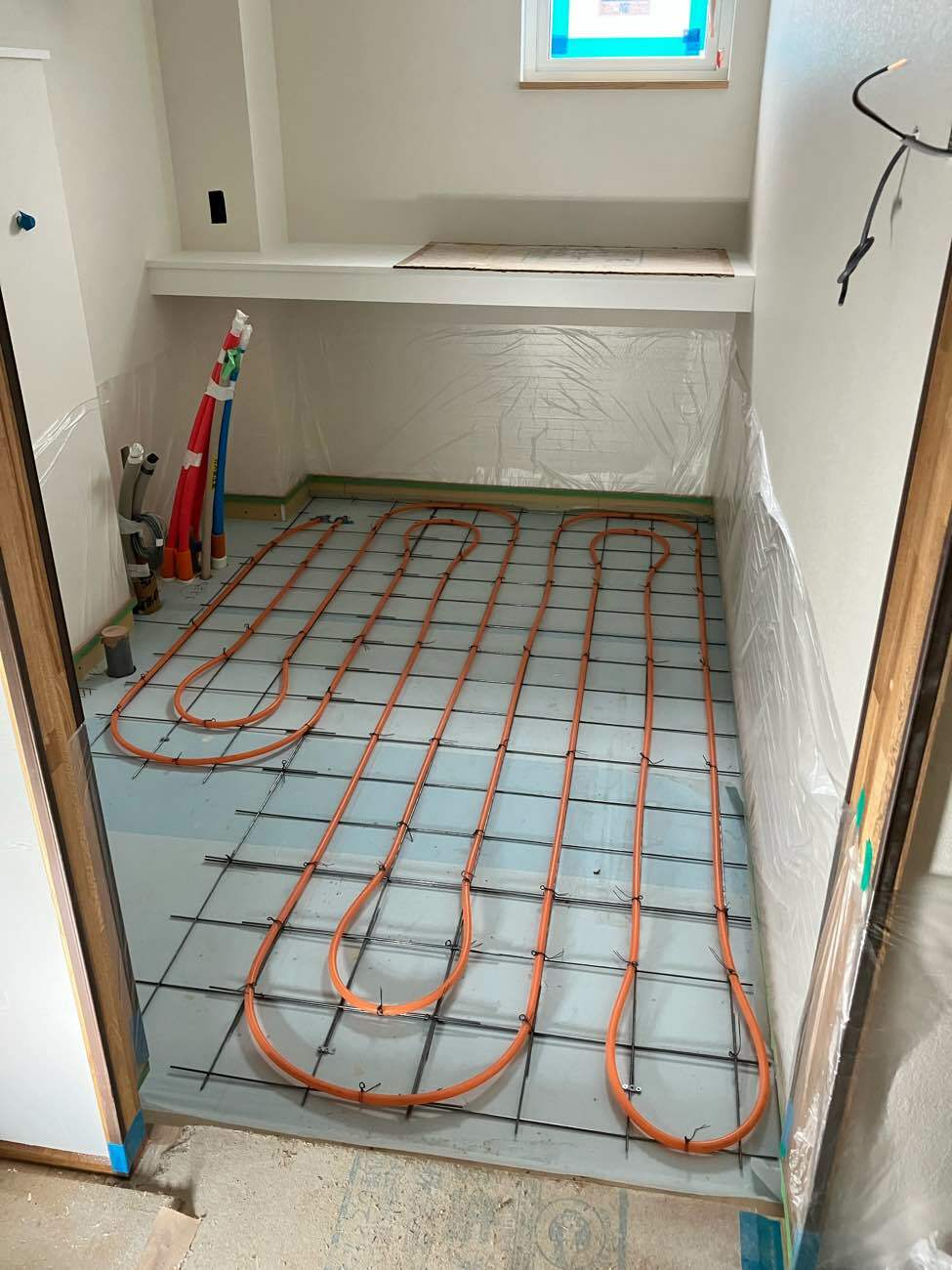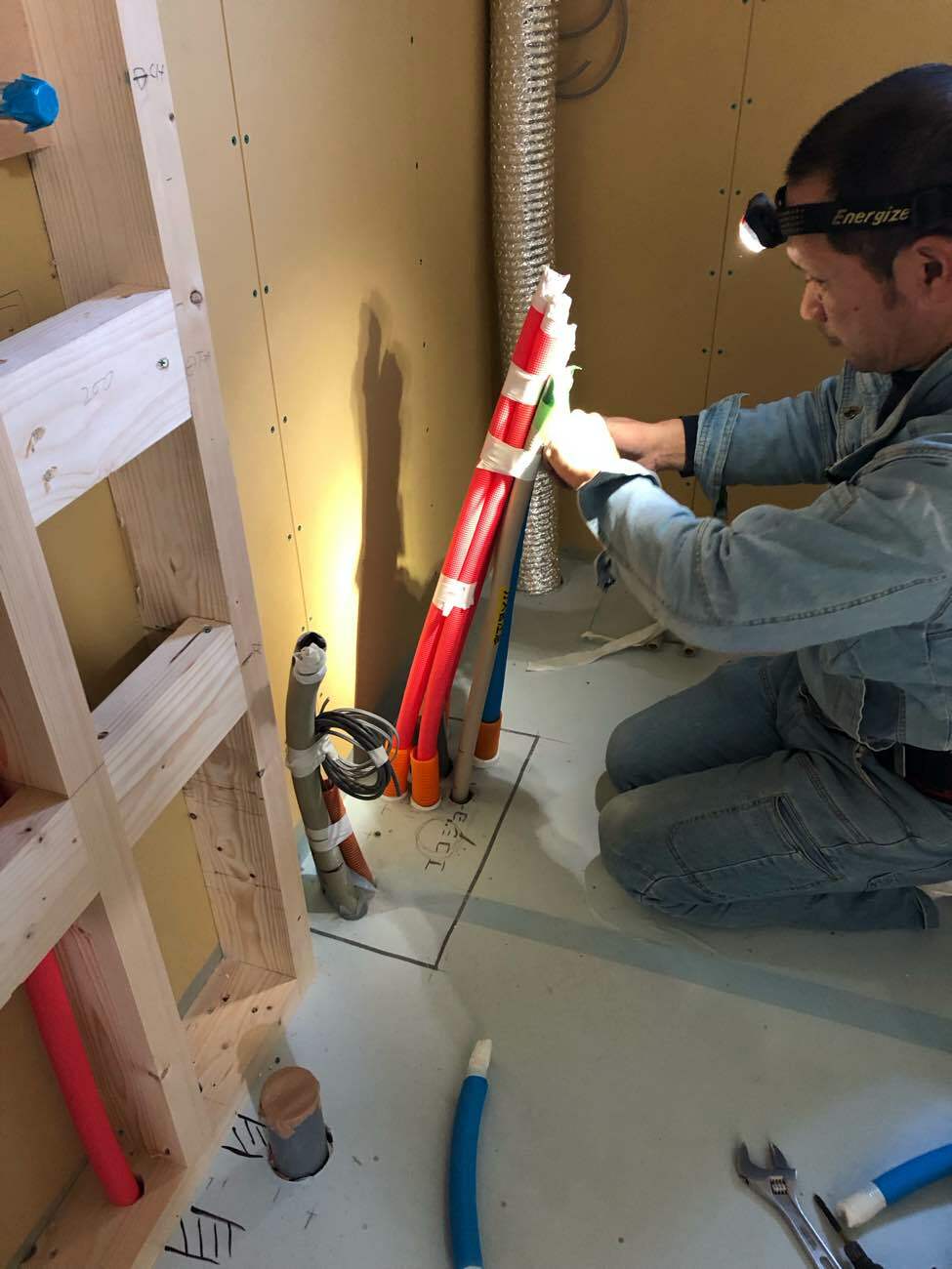 スイッチやコンセントが納められているニッチ部分の木がいいアクセントになっています。脱衣室では、設備屋さんが床暖のパイピングをしています。