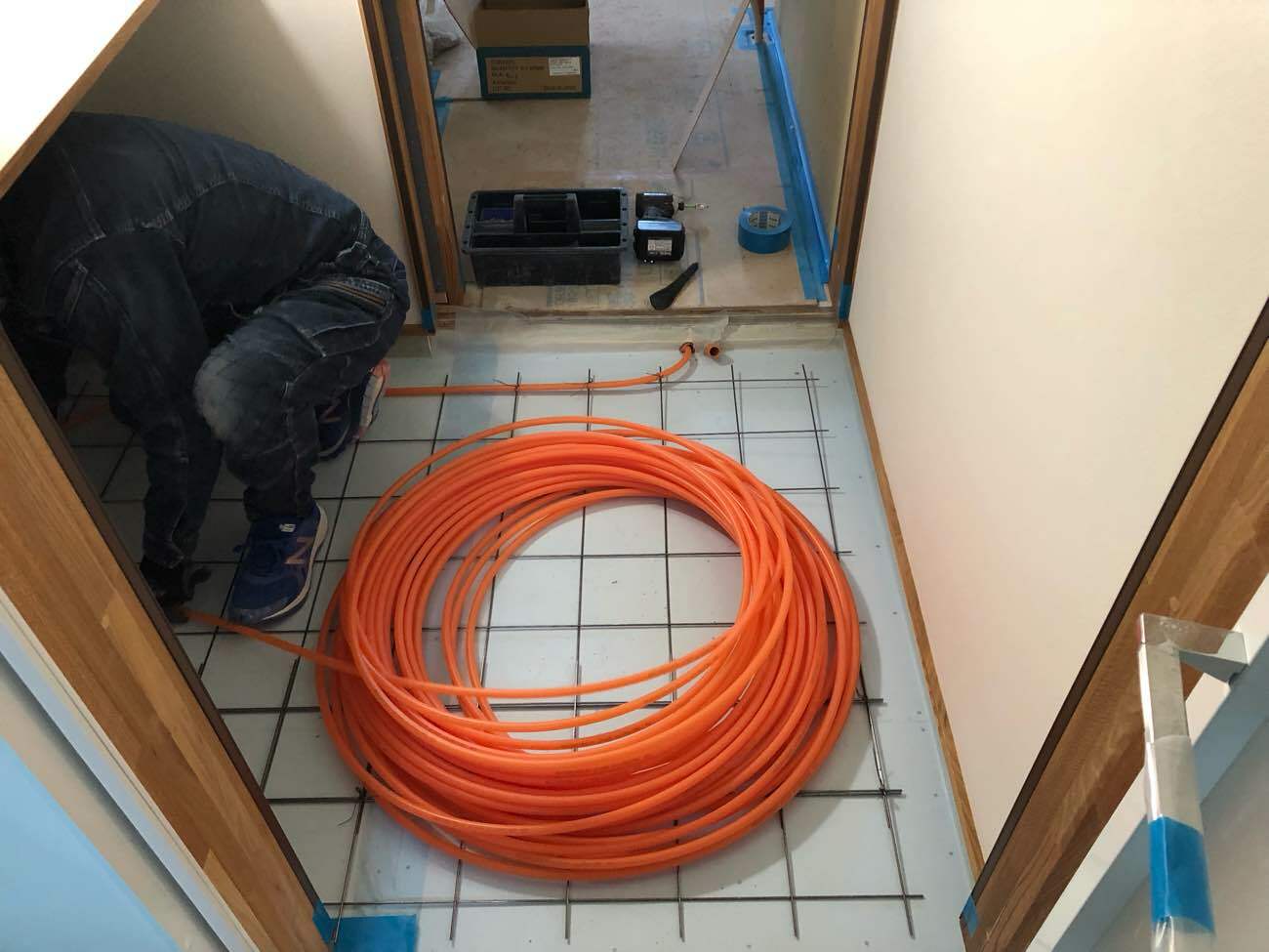 前回の床暖のパイピング作業が終わり、モルタルを流していきます。