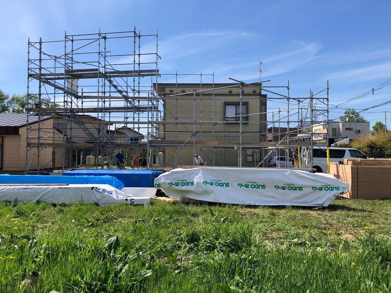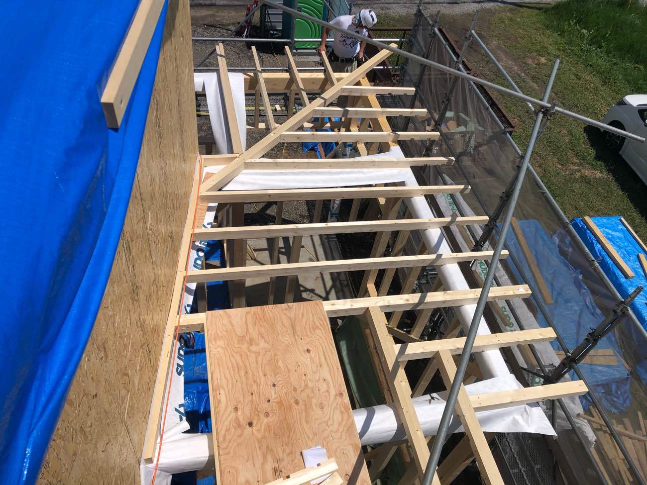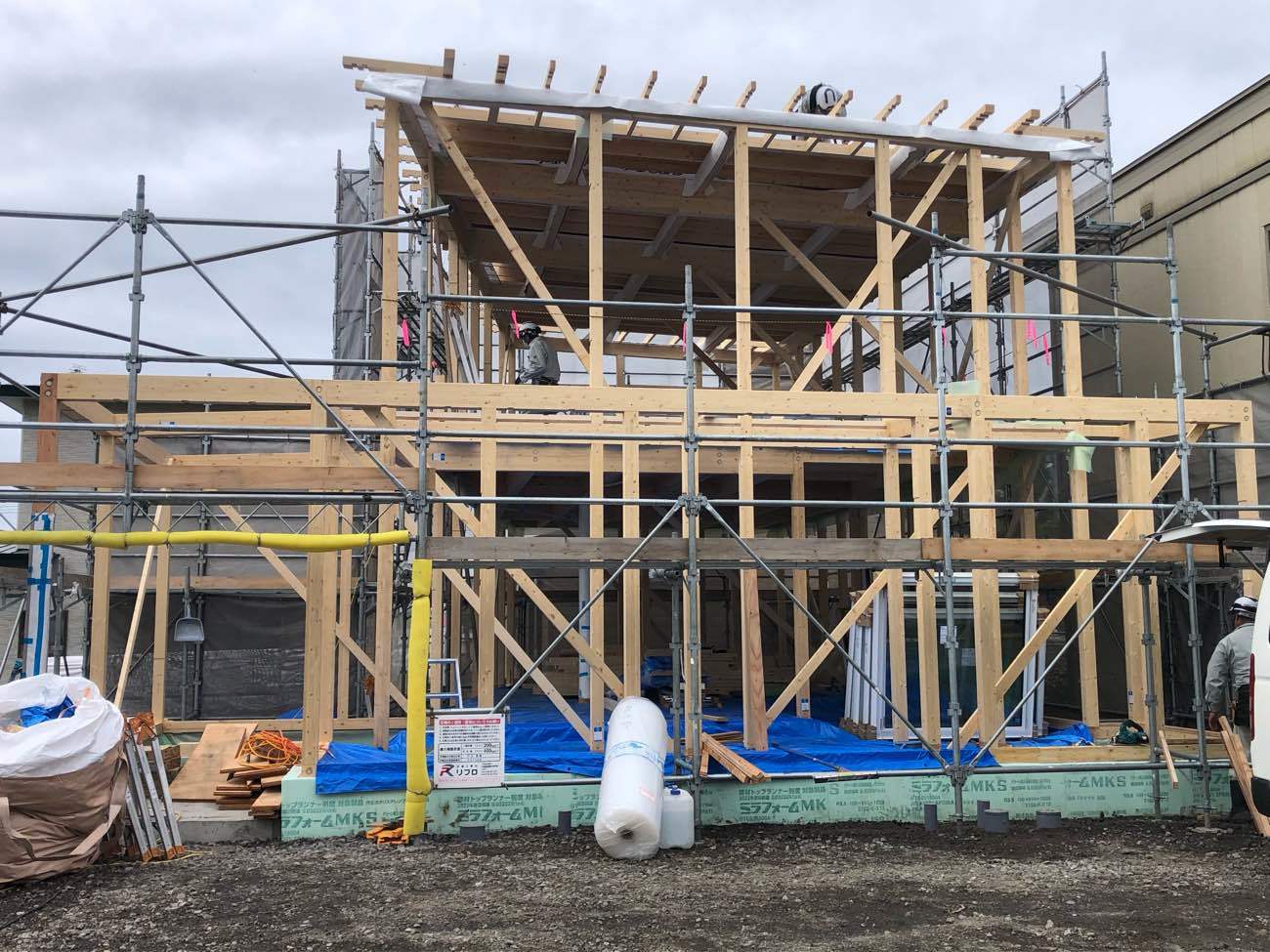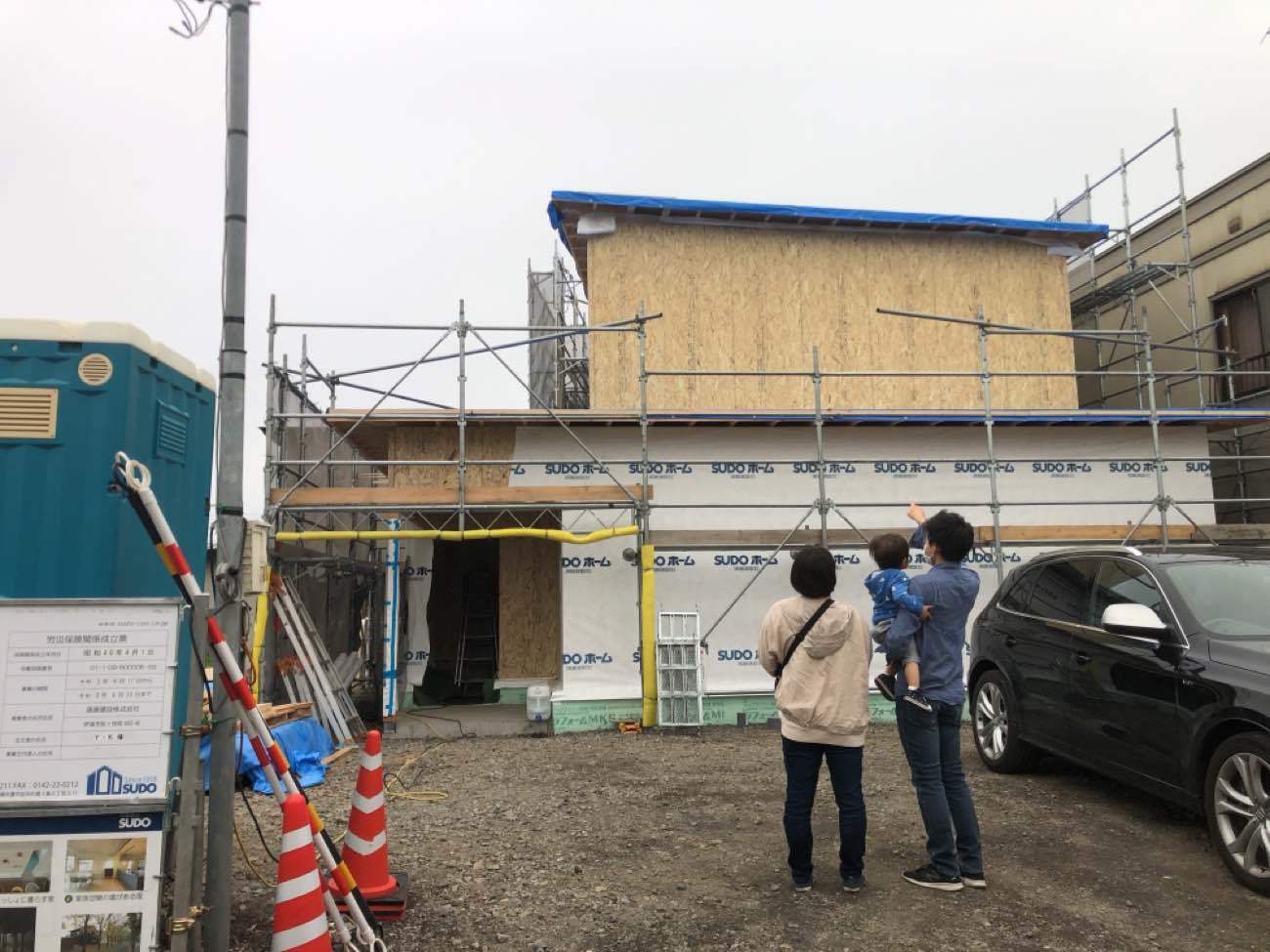 大工さんの顔合わせ。外壁の構造用合板を貼り終えた