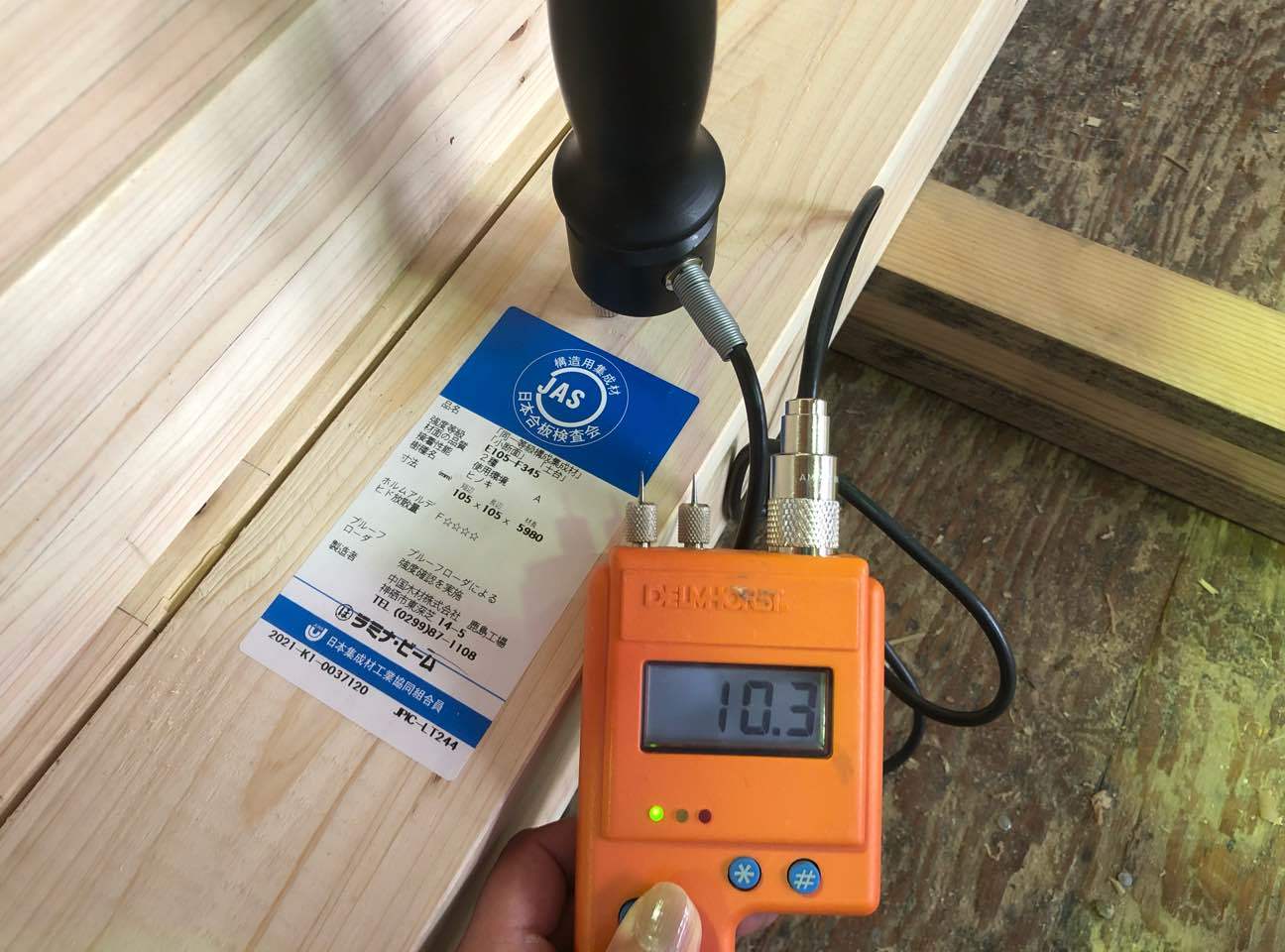整頓された構造材の含水率をチェック中。土台になるヒノキは「10.3%」