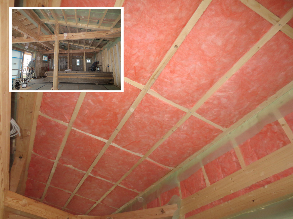200㎜の断熱材を屋根タルキ内に充填して、下地を組んだら105㎜の断熱材を入れます。