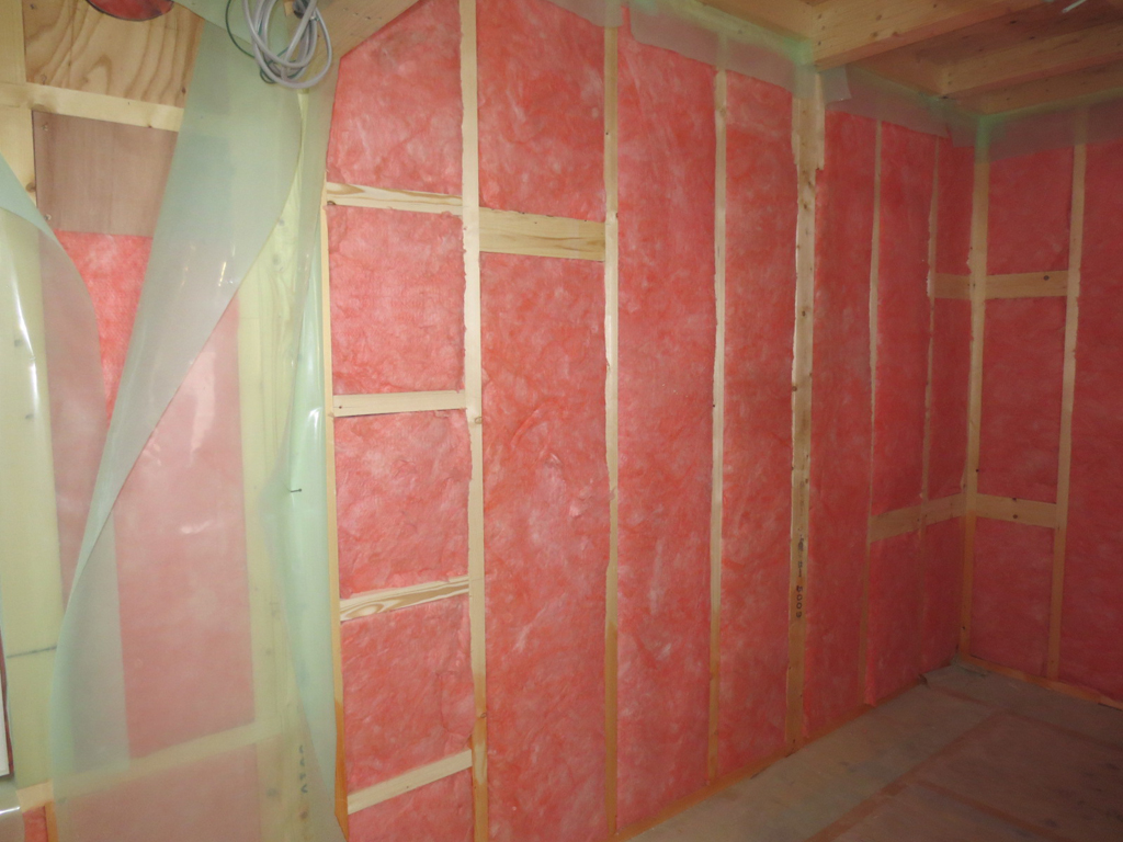 壁の断熱材も大分入りました。ギューギューに押し込まず隙間なくフワっと入れるのが大事です。