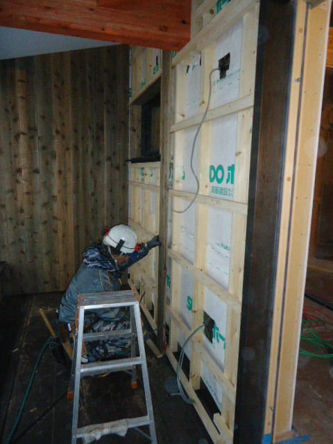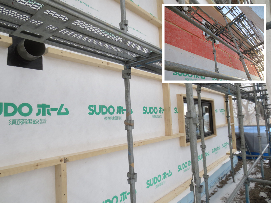 外壁側にも105㎜の材料で下地を組んで断熱材を入れて行きます。