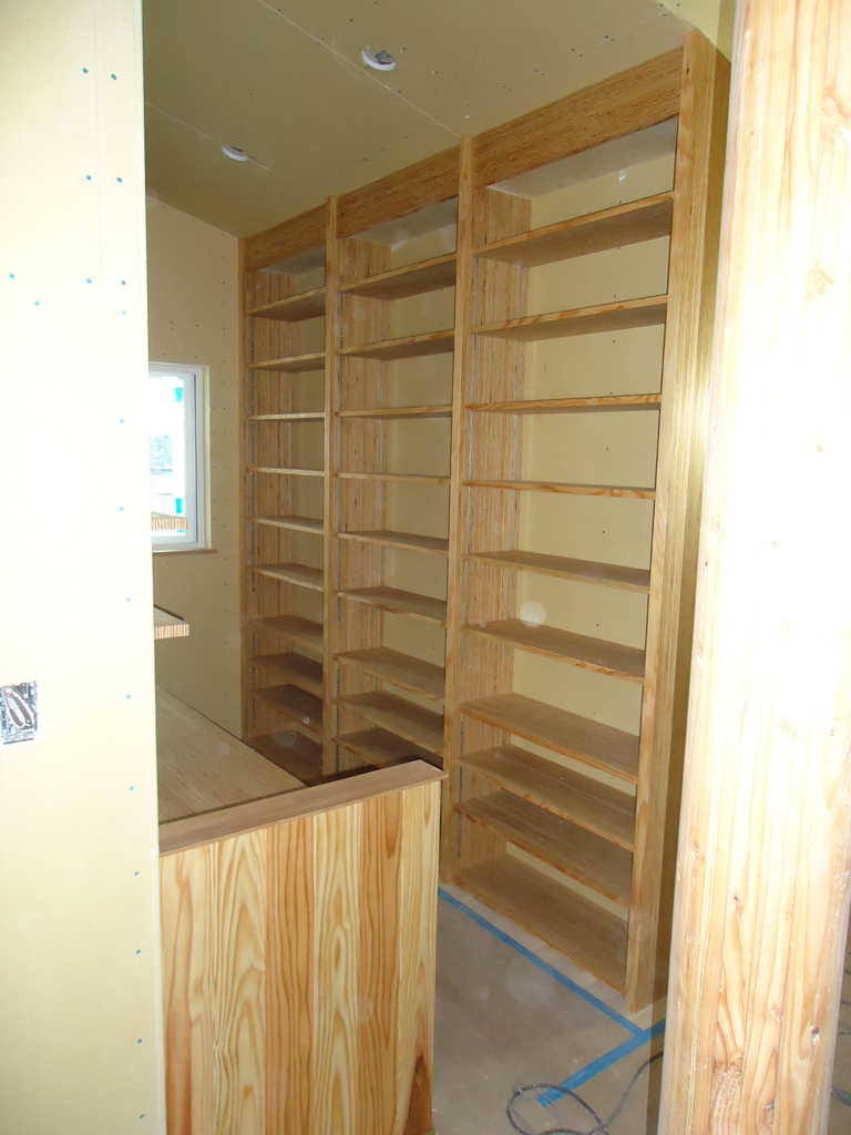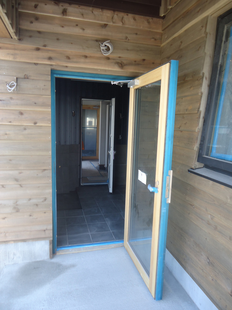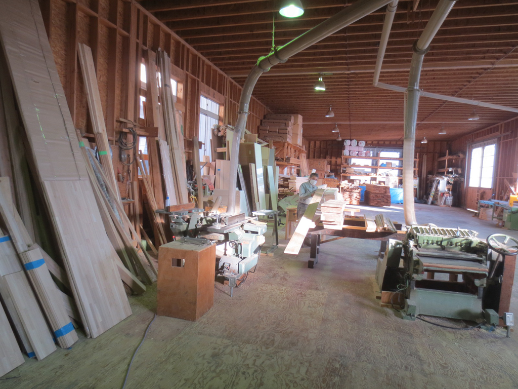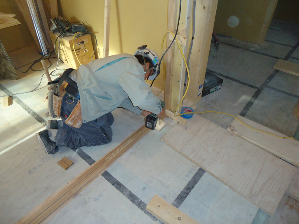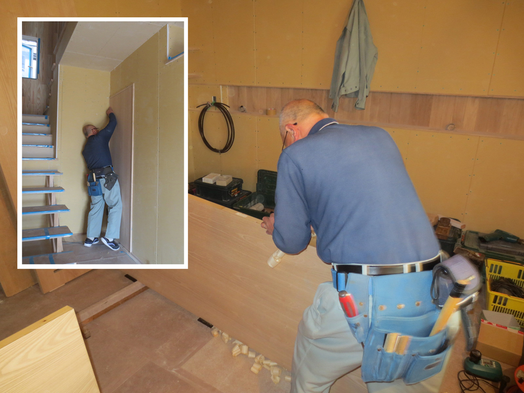 現場はグラスウール入れ真っ最中ですが、そのころM越棟梁は加工場に戻って出入口の木枠加工を行っていました。