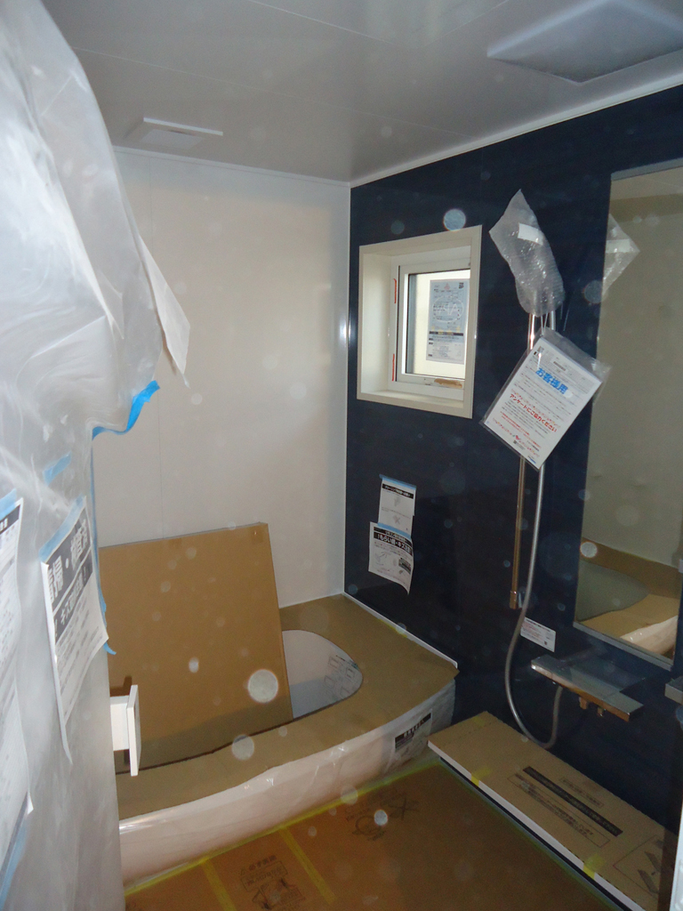 ユニットバスの設置完了です。アクセント壁のネイビーブルーが良いですね。