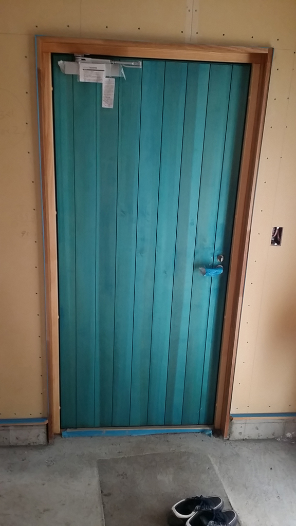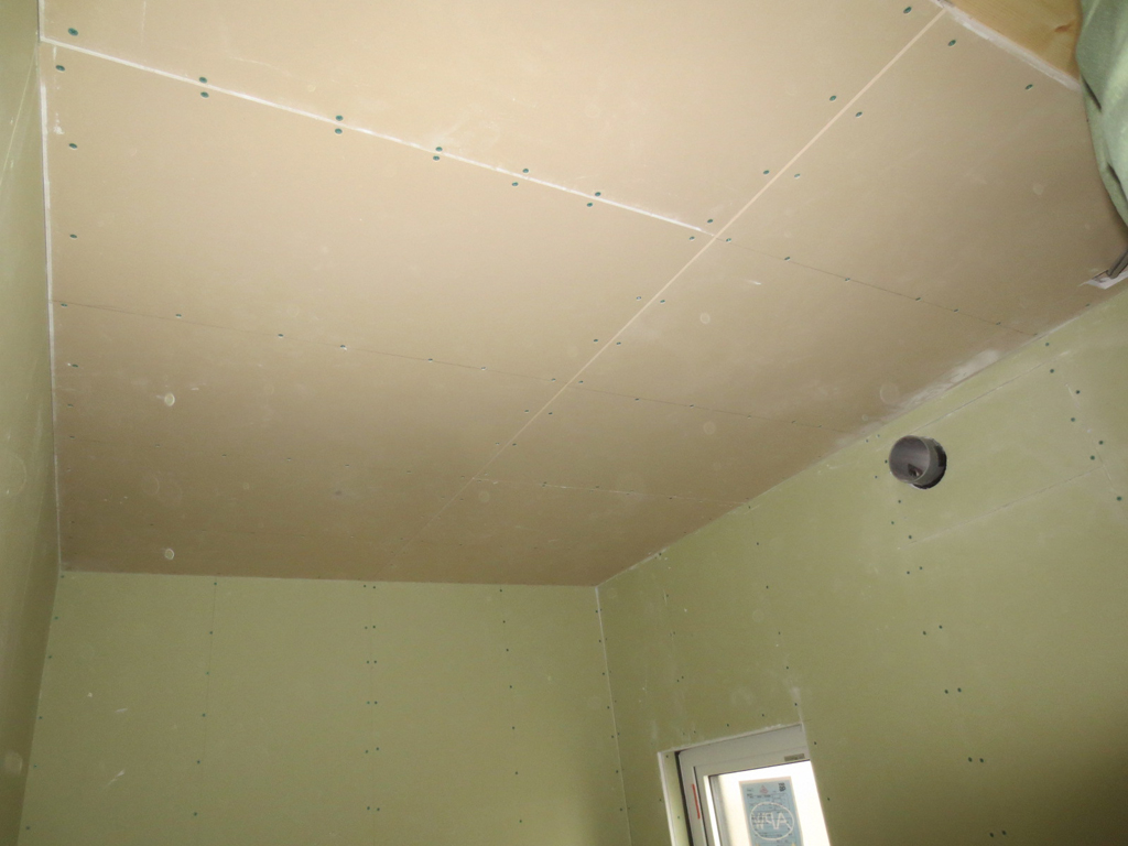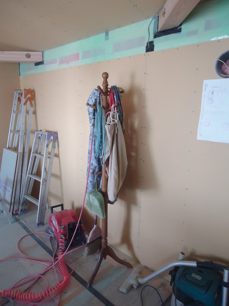 石膏ボードには他にもいろいろ種類があり、こちらの薄いグリーンの物は一般の物より耐水性に優れており、水がかかる可能性がある洗濯室等に使用します。