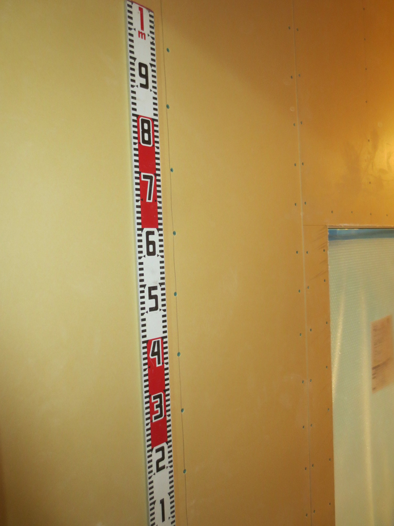 ボード貼りが完了すると、現場担当Sさんが止め付けたビスの間隔を確認します。